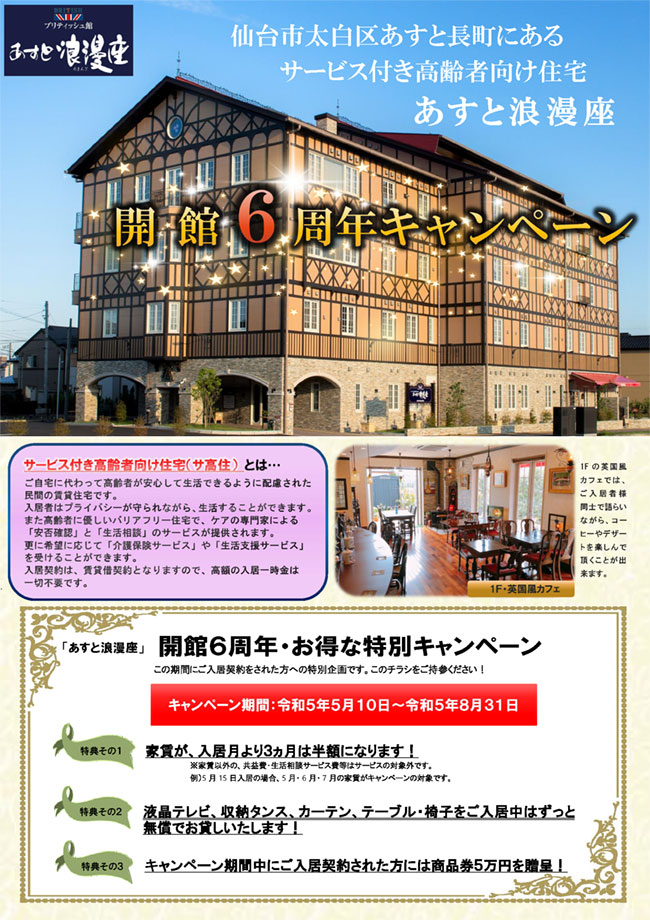中でも「あすと浪漫座」は、特徴のあるサービス付き高齢者向け住宅であると言えます。どうぞ他の施設と比較しながらご検討をしてみてください。