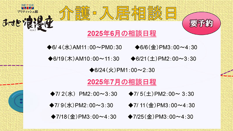 1.月に数回、あすと浪漫座へのご入居をご検討されている方へ、介護・入居相談日を設けています。