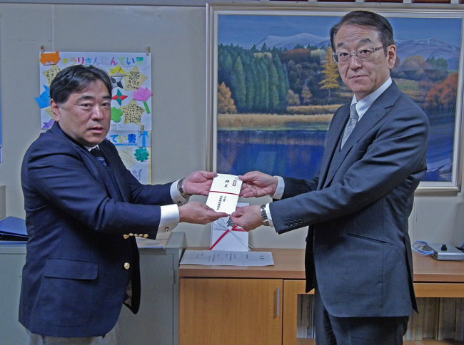 この度、皆様からいただいたプルタブを換金し、上山市立南中学校へ図書カードを贈呈いたしました。