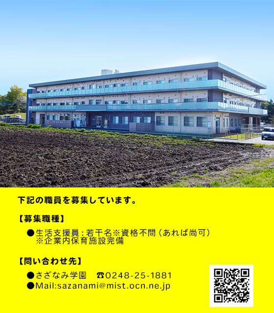 私たちさざなみ学園は、障害を個性のひとつと捉え、利用者さま1人1人と幸せや喜びを分かち合えるよう、精一杯のお手伝いをいたします。