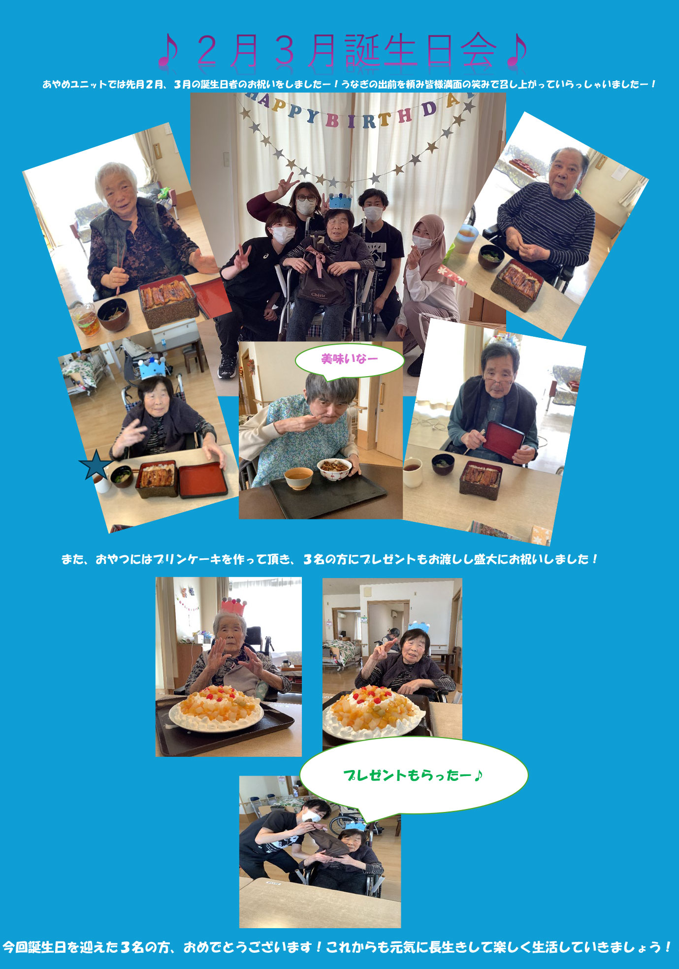 2月生まれの方の合同誕生日会をしました!プリンケーキを作ってもらいみんなでおいしくいただきました。