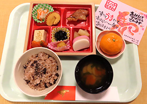 赤飯、お雑煮風すまし汁、おせち盛り合わせ