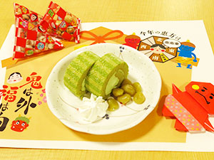 抹茶ロールケーキ、うぐいす豆付き