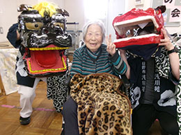 お昼はお祝い膳(松花堂弁当)余興は職員による「どじょうすくい」「よさこい」「歌謡ショー」を行い楽しんで頂けました。浅川苑の最高年齢は106歳です。ゴールドのちゃんちゃんこを着て頂きめでたいですね!