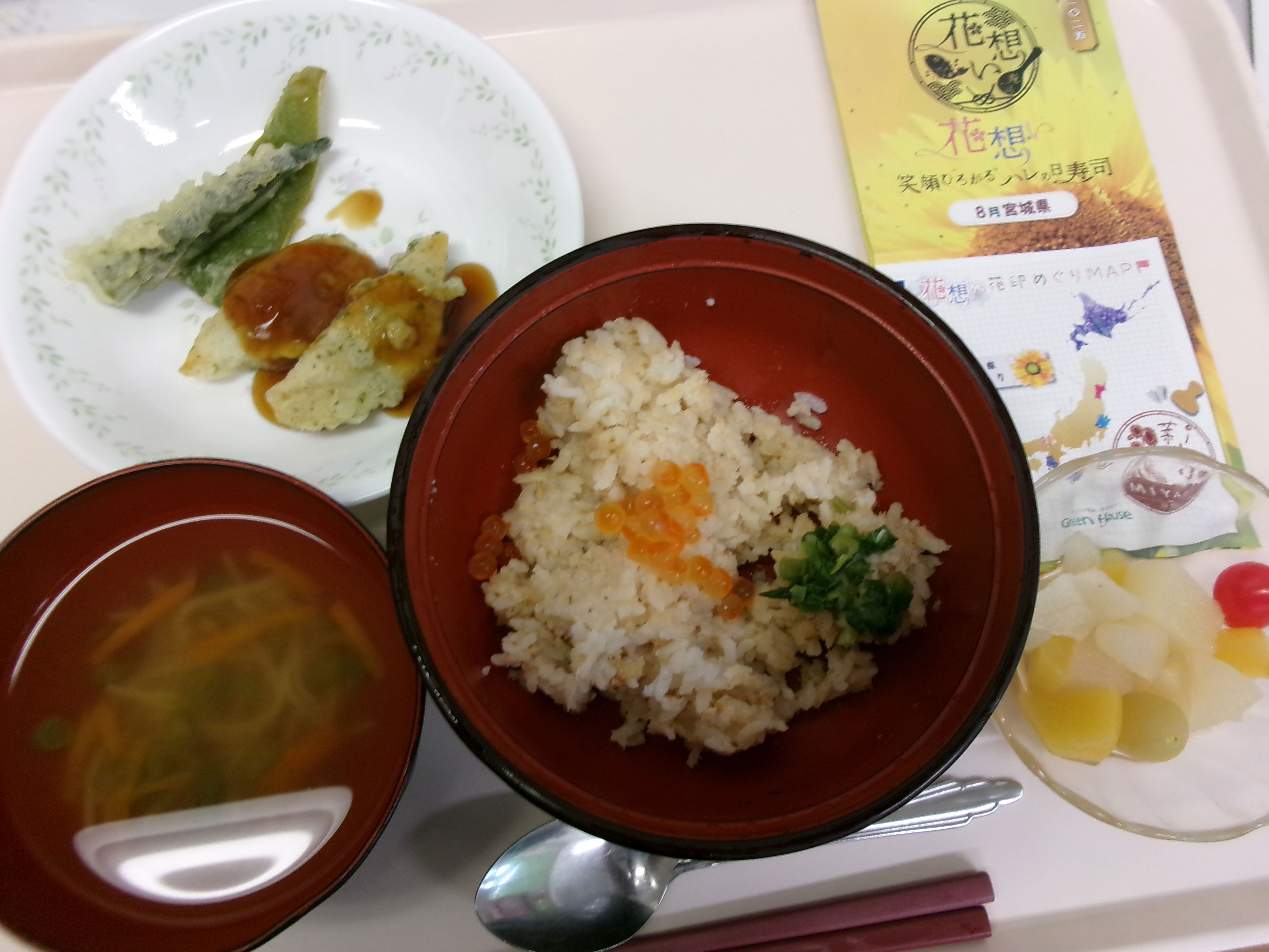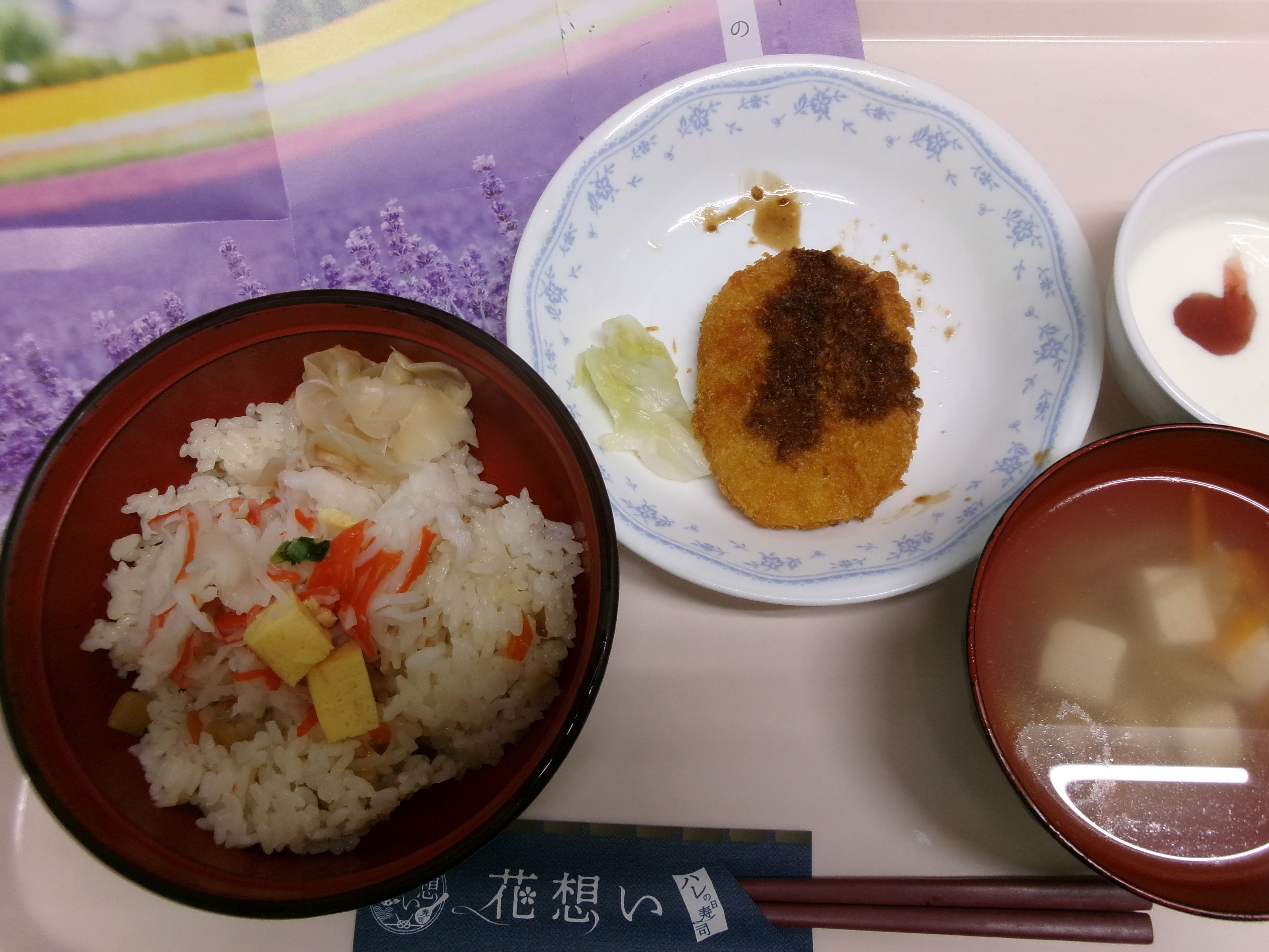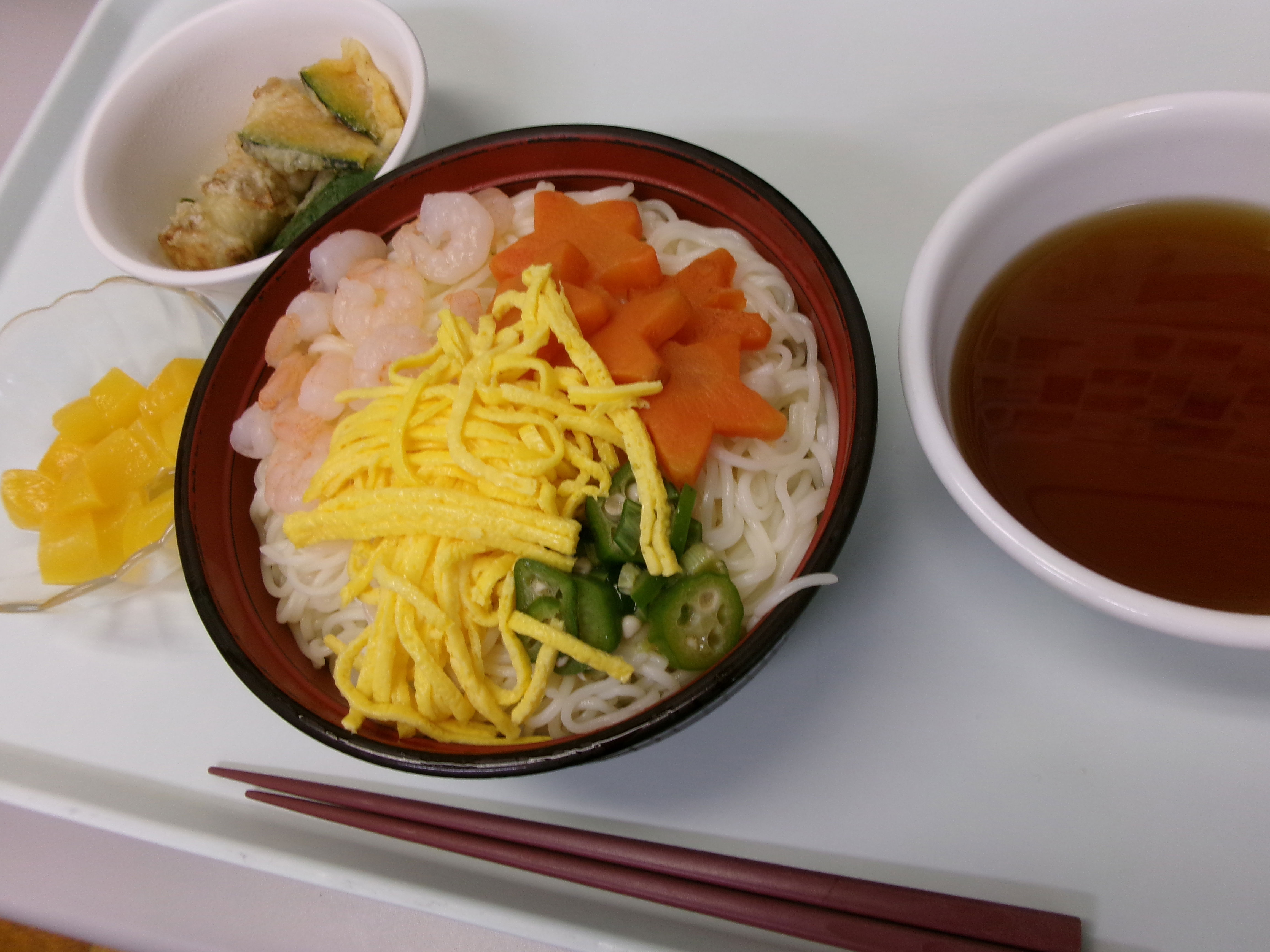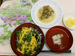 7月のハレの日は「かに寿司」を提供しました。酢飯のご飯はどの方も大好きですね。海の幸が入ったちらし寿司と北海道と言えばトウモロコシの入ったコロッケでお腹がいっぱいになりました。
