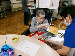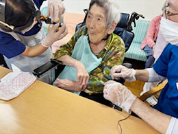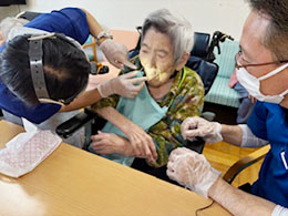 固形物の飲み込みが難しくなってきたご利用者様に対し、歯科医師の先生による摂食嚥下テストを行っています。摂食・嚥下(せっしょく・えんげ)は、食物を認識して口に取り込むことに始まり、胃に至るまでの一連の過程を指します。これらの過程のどこかが障害されると、摂食・嚥下障害となります。安全で安心な食事摂取を目指しています。