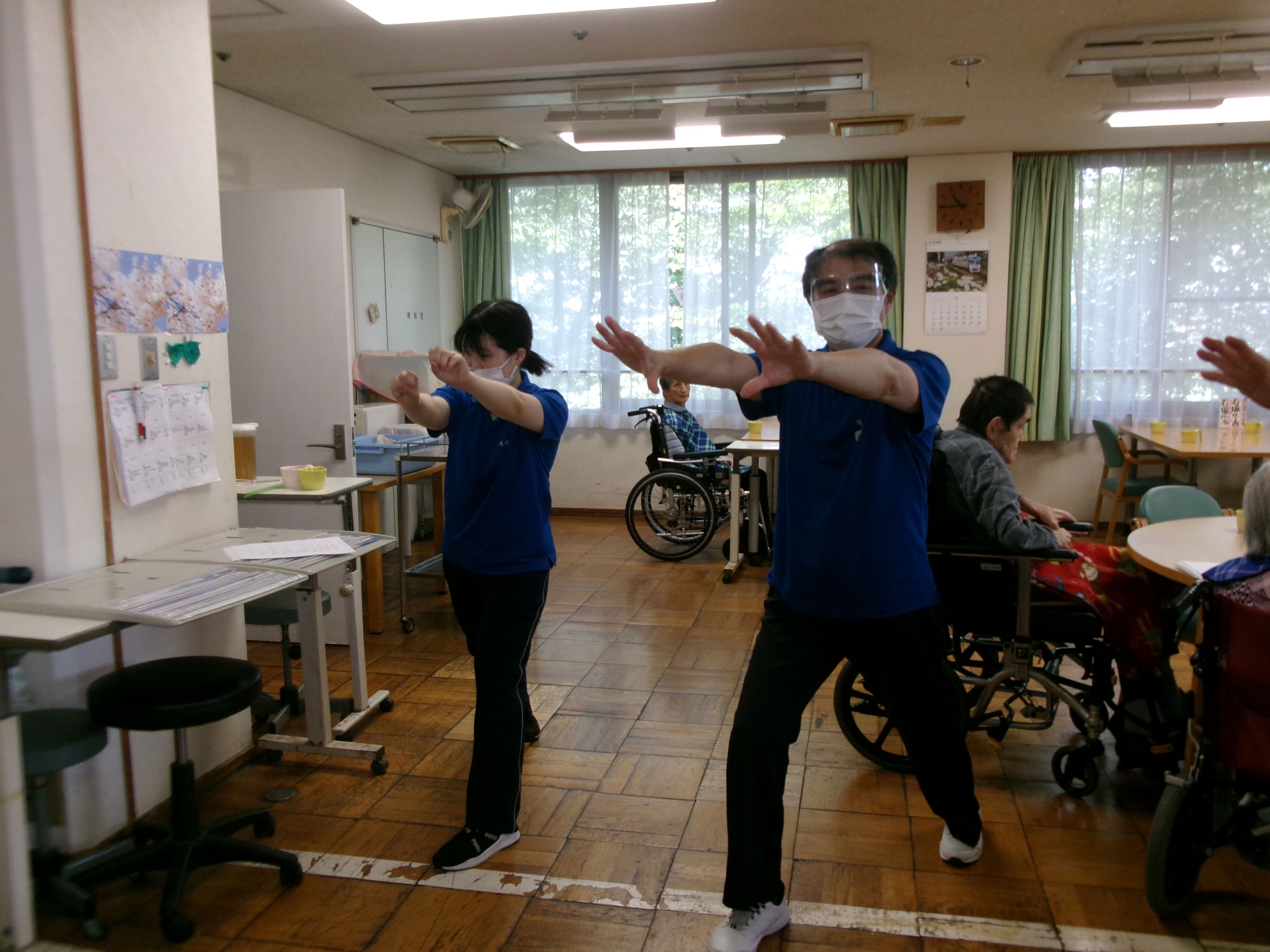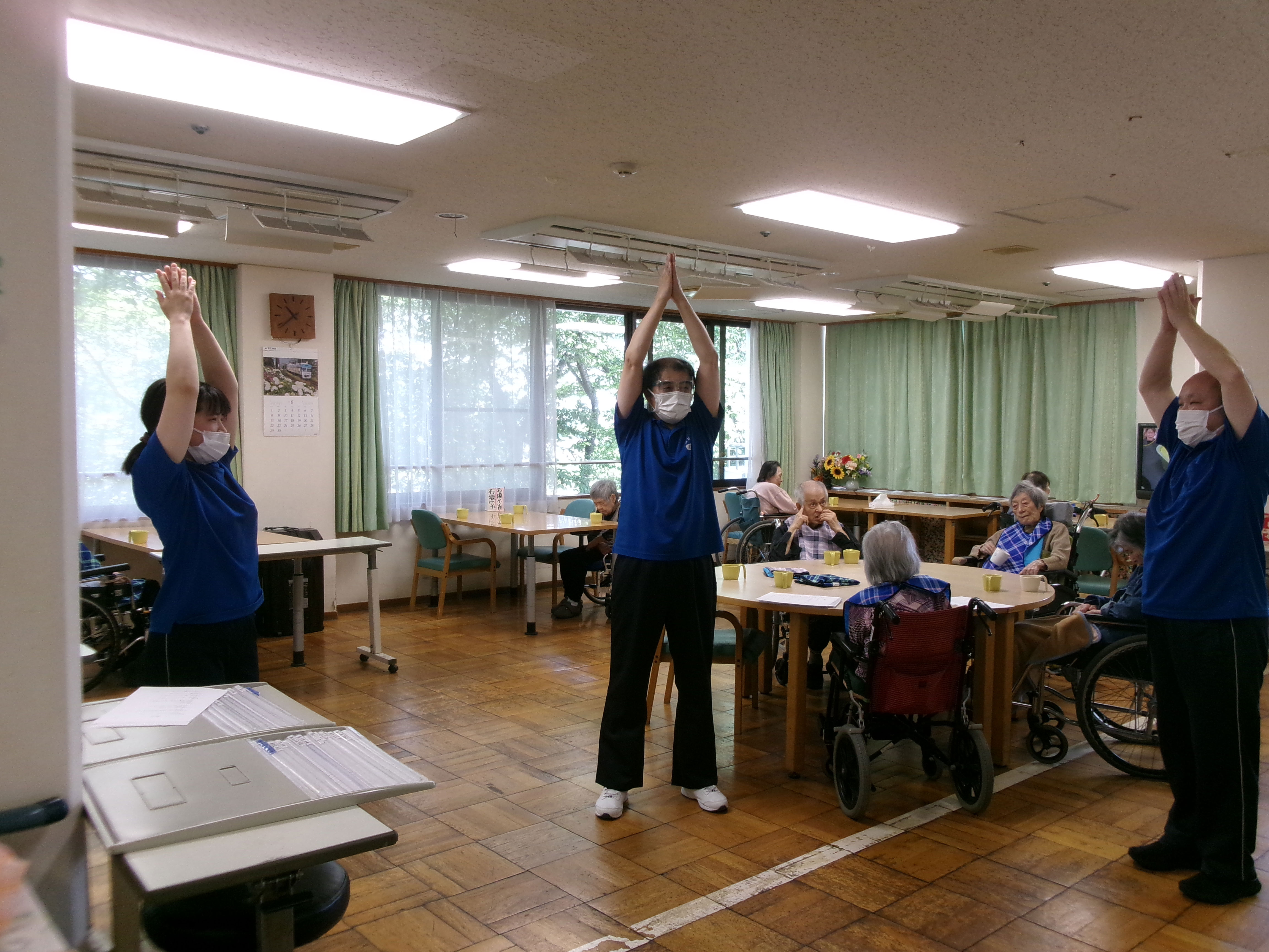 介護員の職業病と言われている腰痛ですが、移乗技術の向上と、体操を行うことで腰痛予防に努めています。腰痛予防研修として「業務前のストレッチ」と「移乗時に気を付けていること」を職員間で確認し合いました。