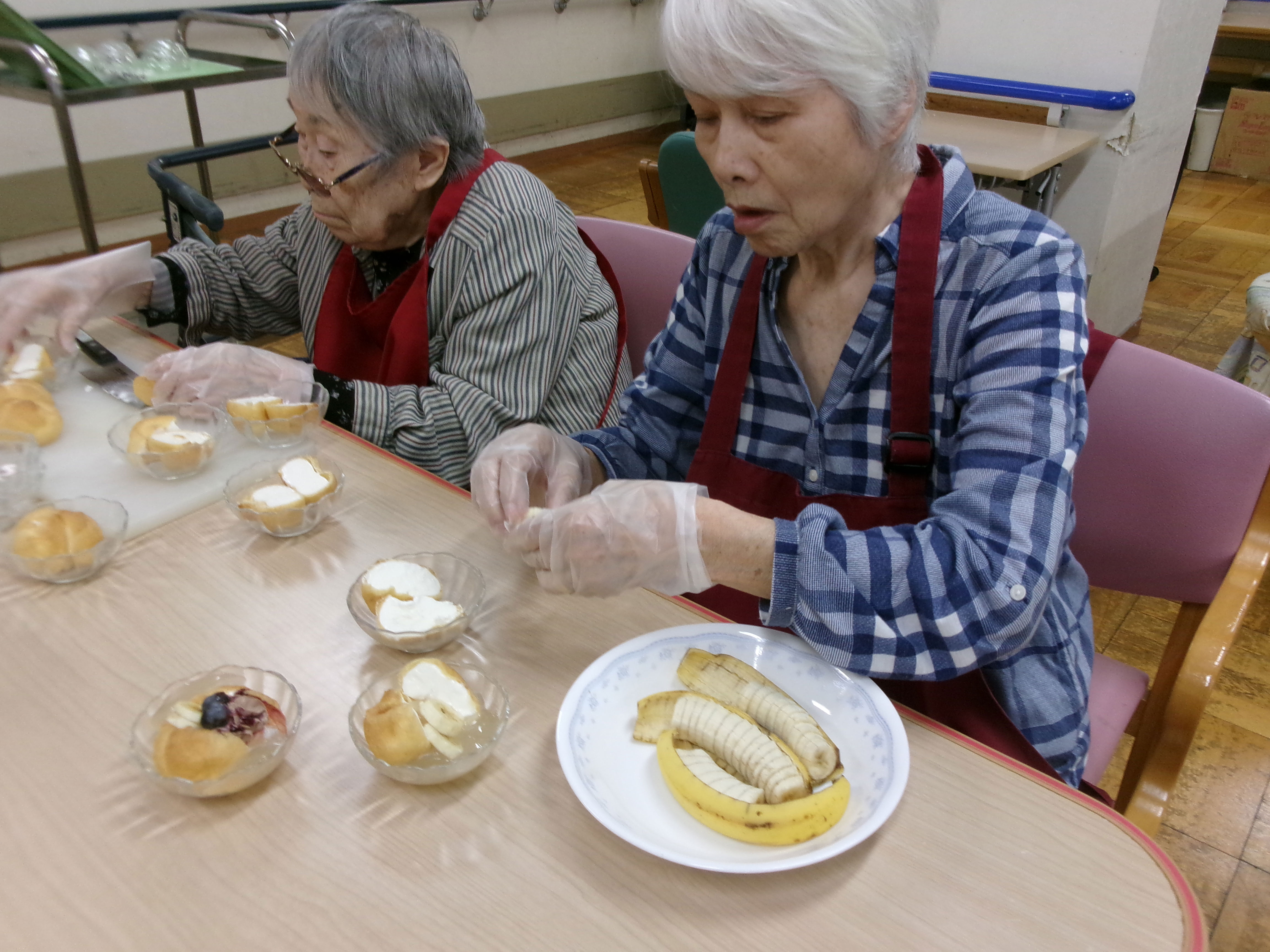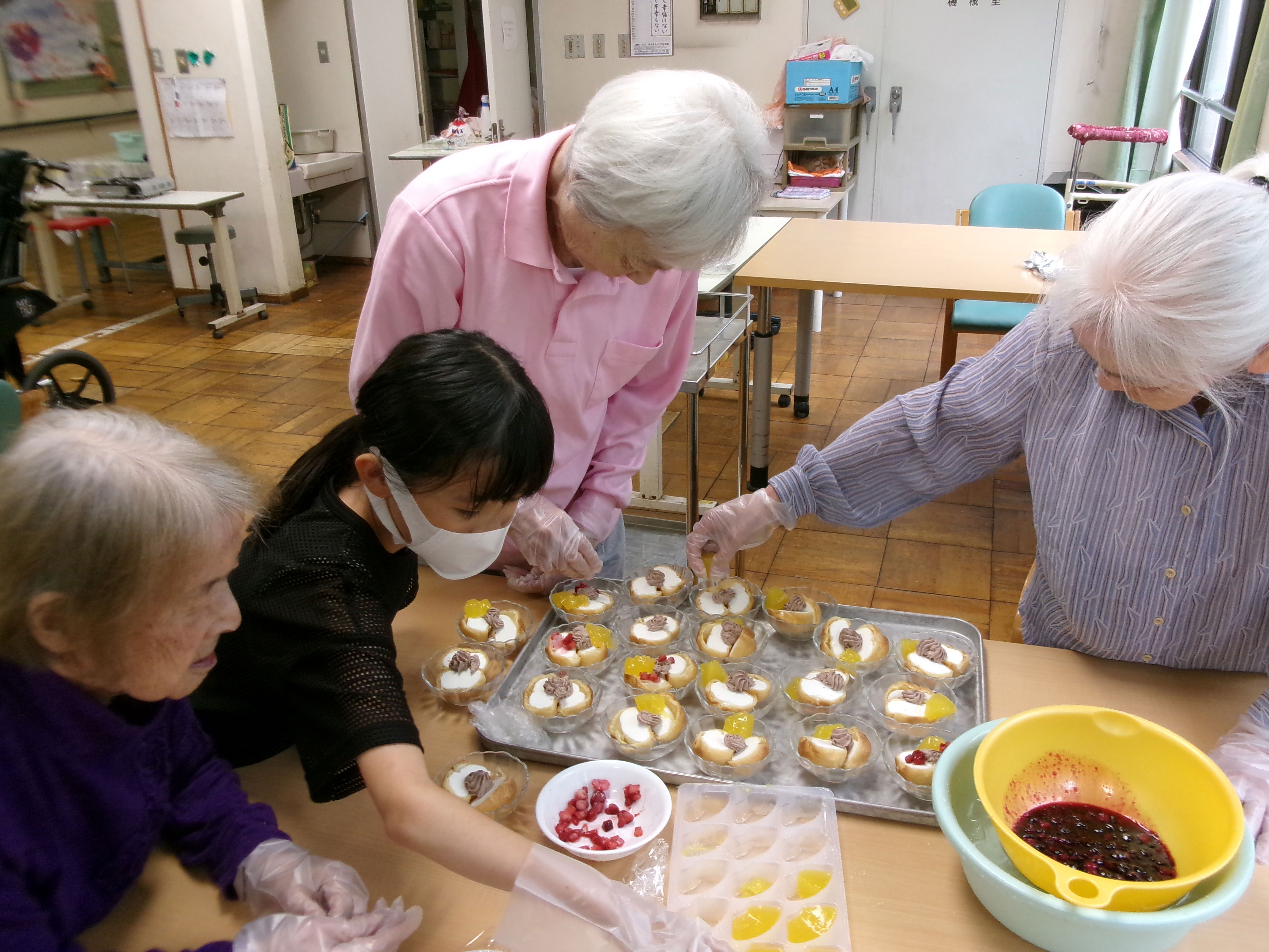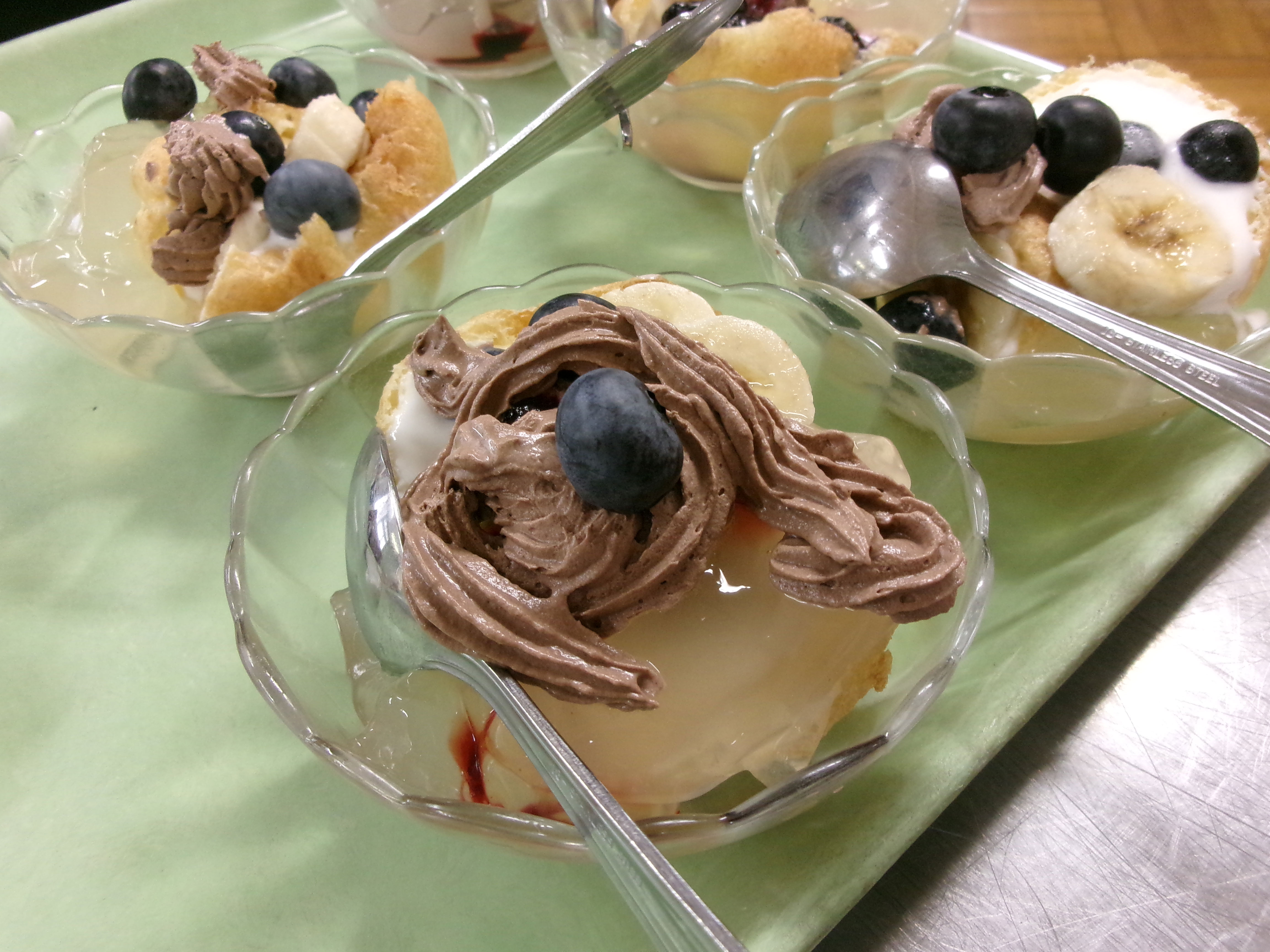 各階でおやつ作りを行いました。フルーチェを作り、チョコやフルーツをトッピング しました。