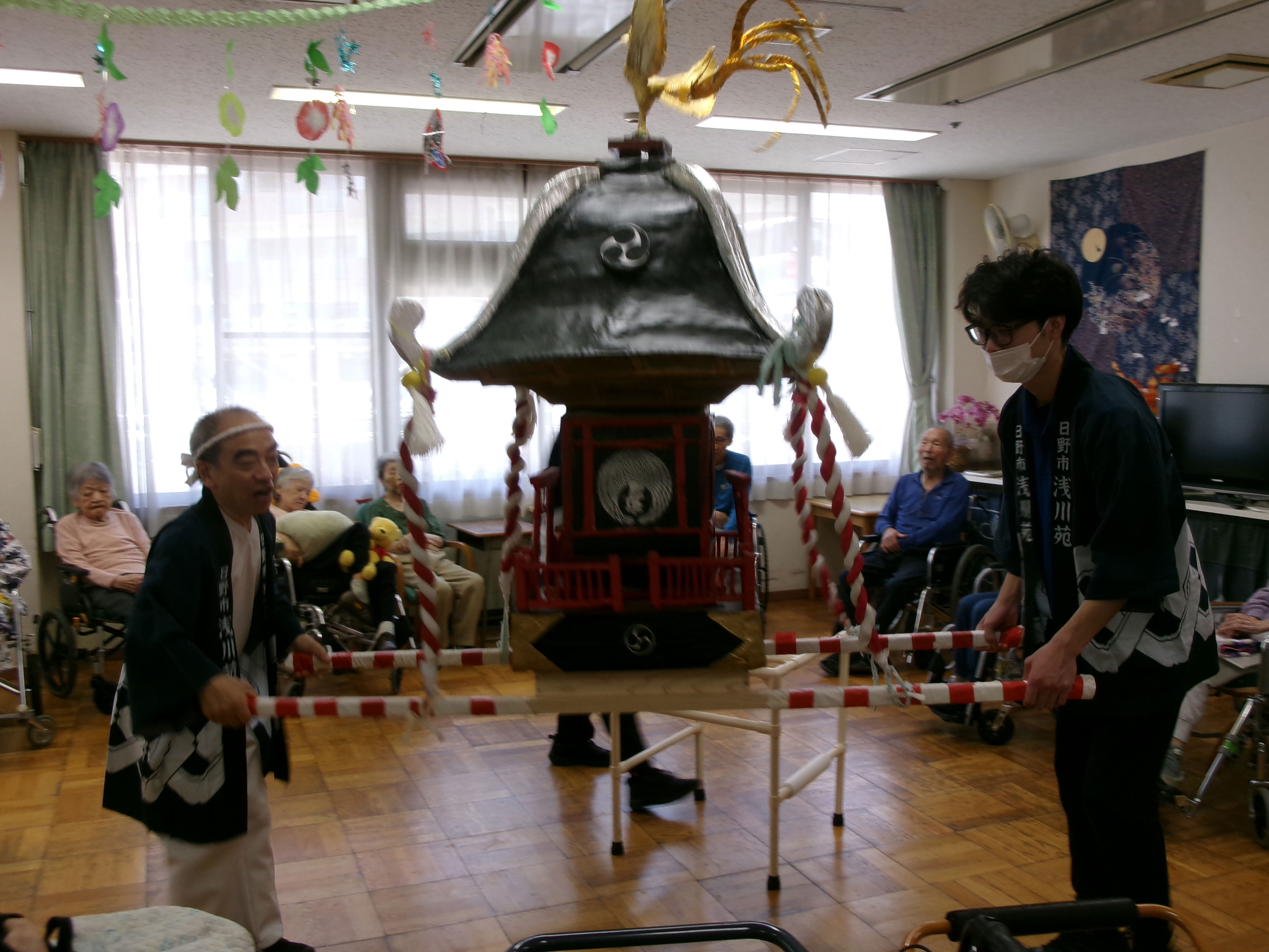 若宮愛宕神社例大祭の御神輿が浅川苑の正面玄関で休憩され、その間御神輿を見せて頂けました。担ぎ手の声や迫力に皆さんとても楽しそうでした。1日お祝いムードの良い1日を過ごしました。