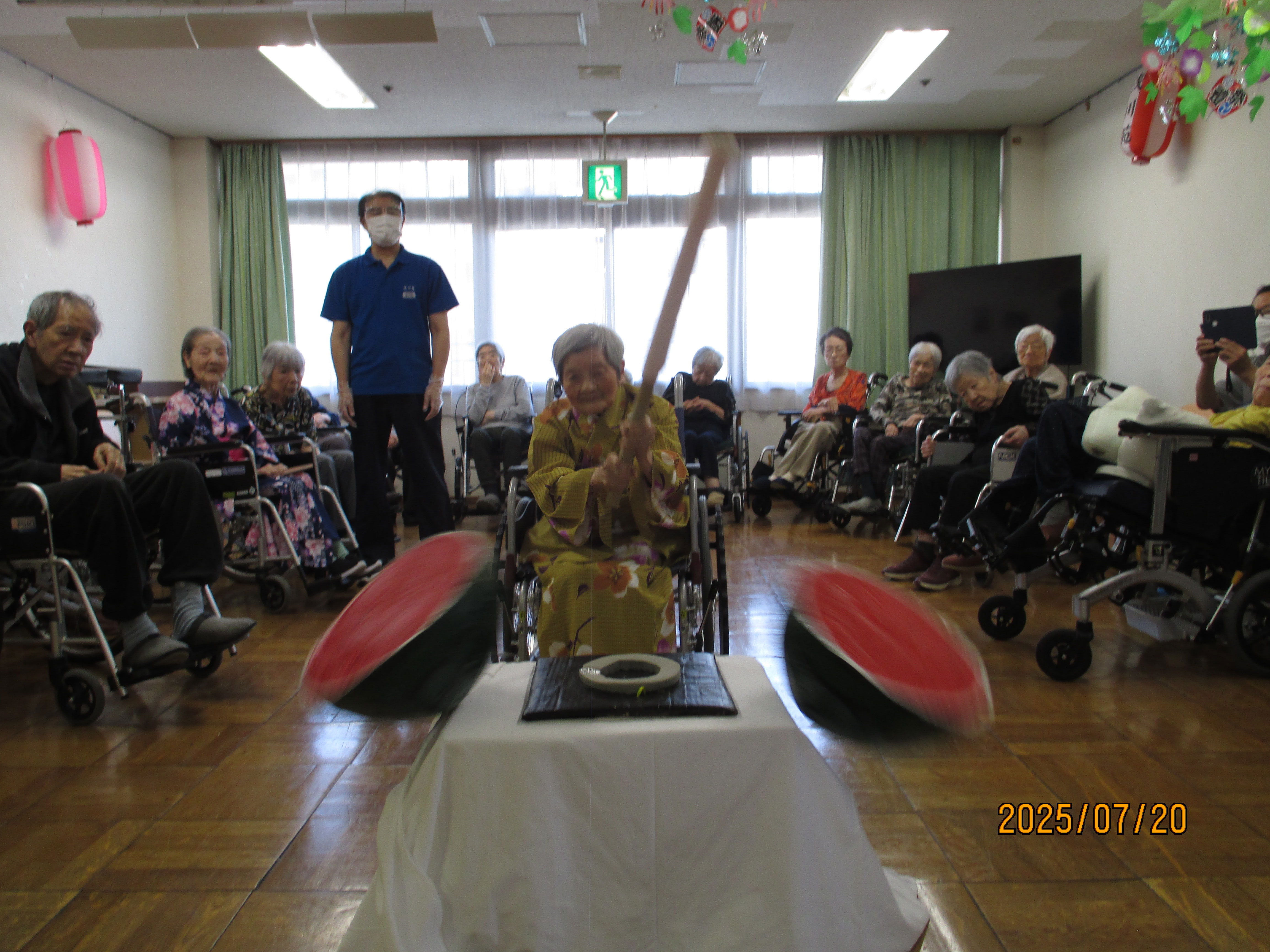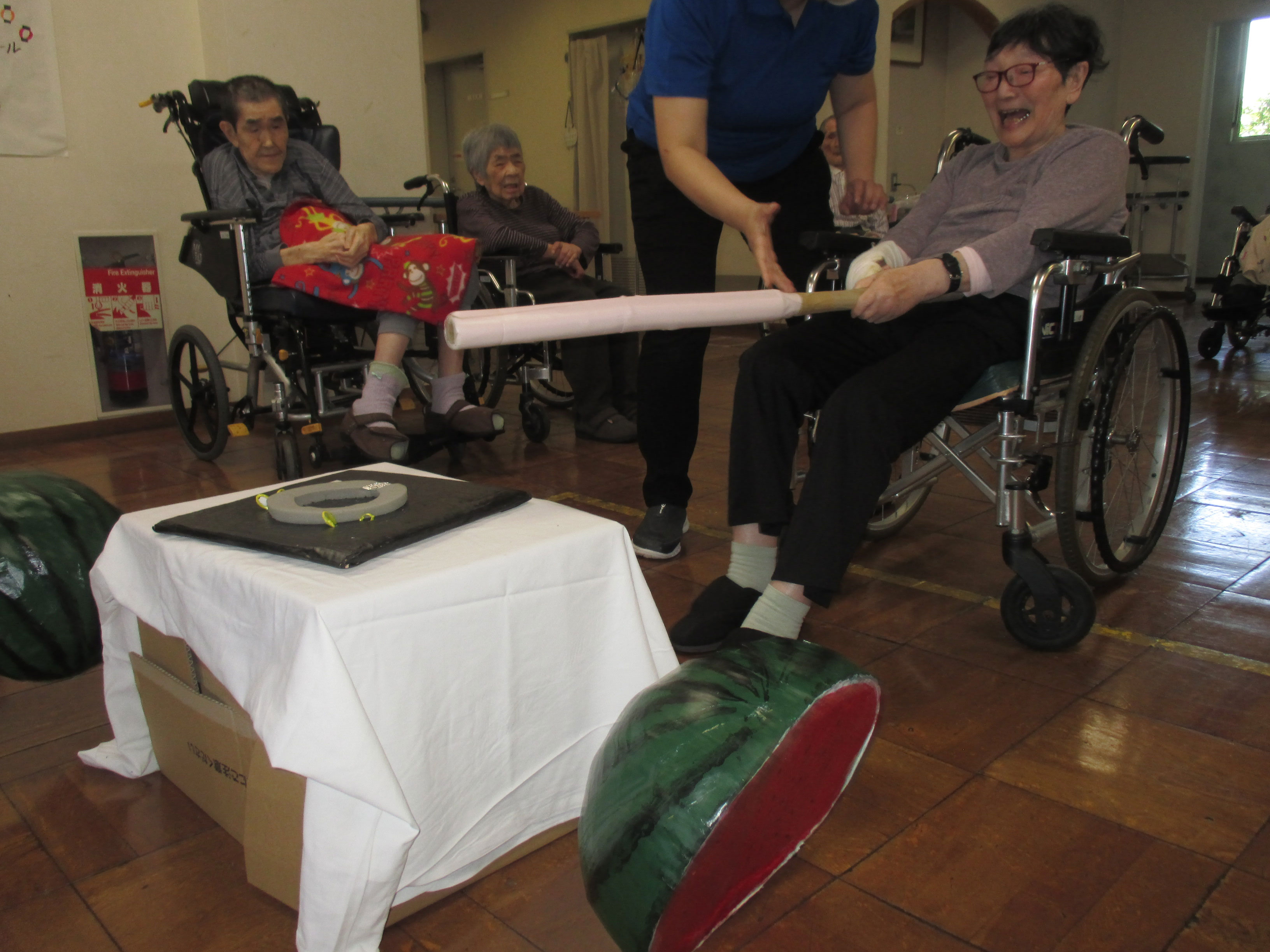 毎年の夏行事「納涼会」を行いました。コロナの影響を受け、ご家族やボランティアさんの参加は叶いませんでしたが、すいか割りに盆踊りと、楽しい一日を過ごしました!