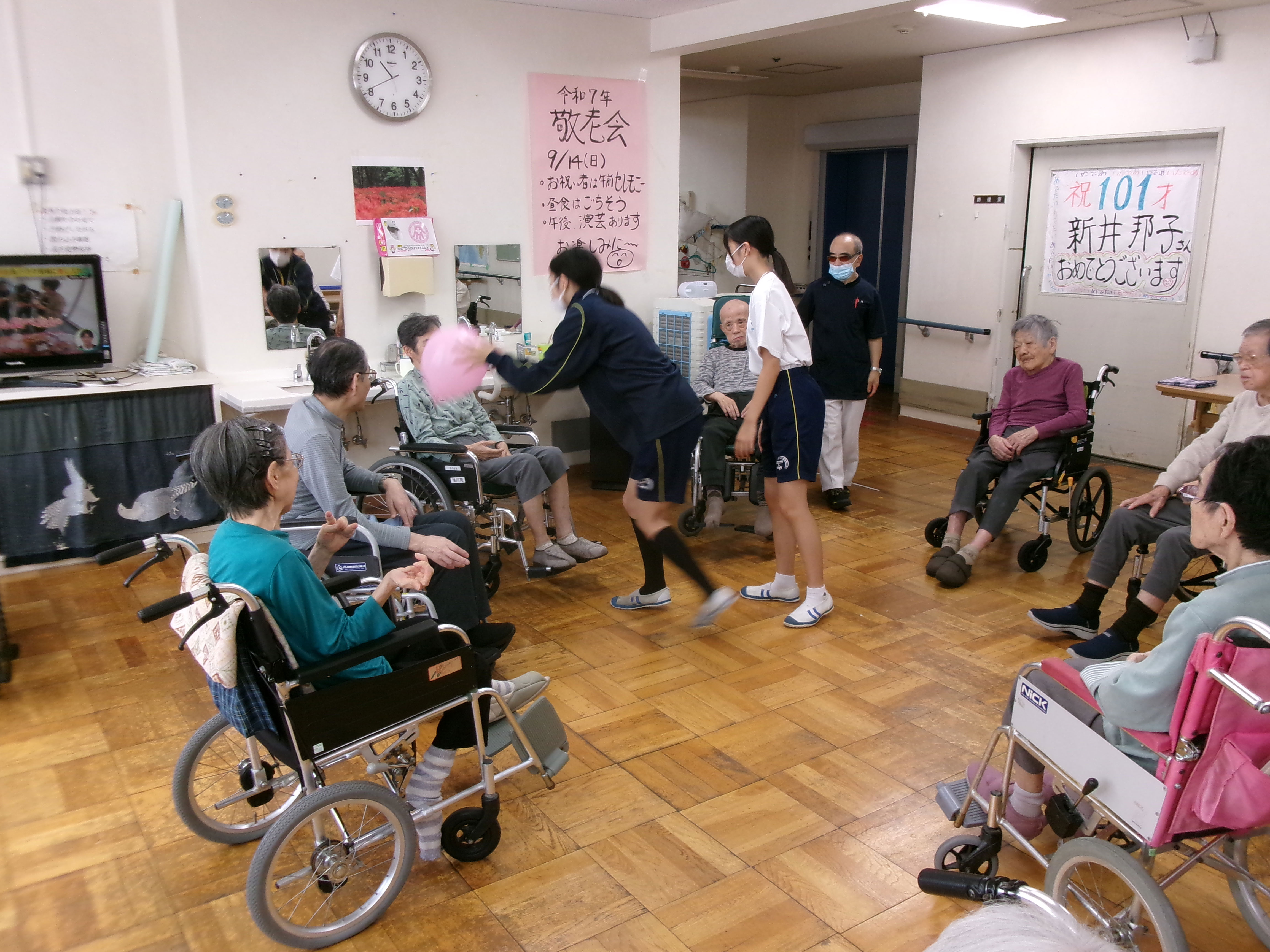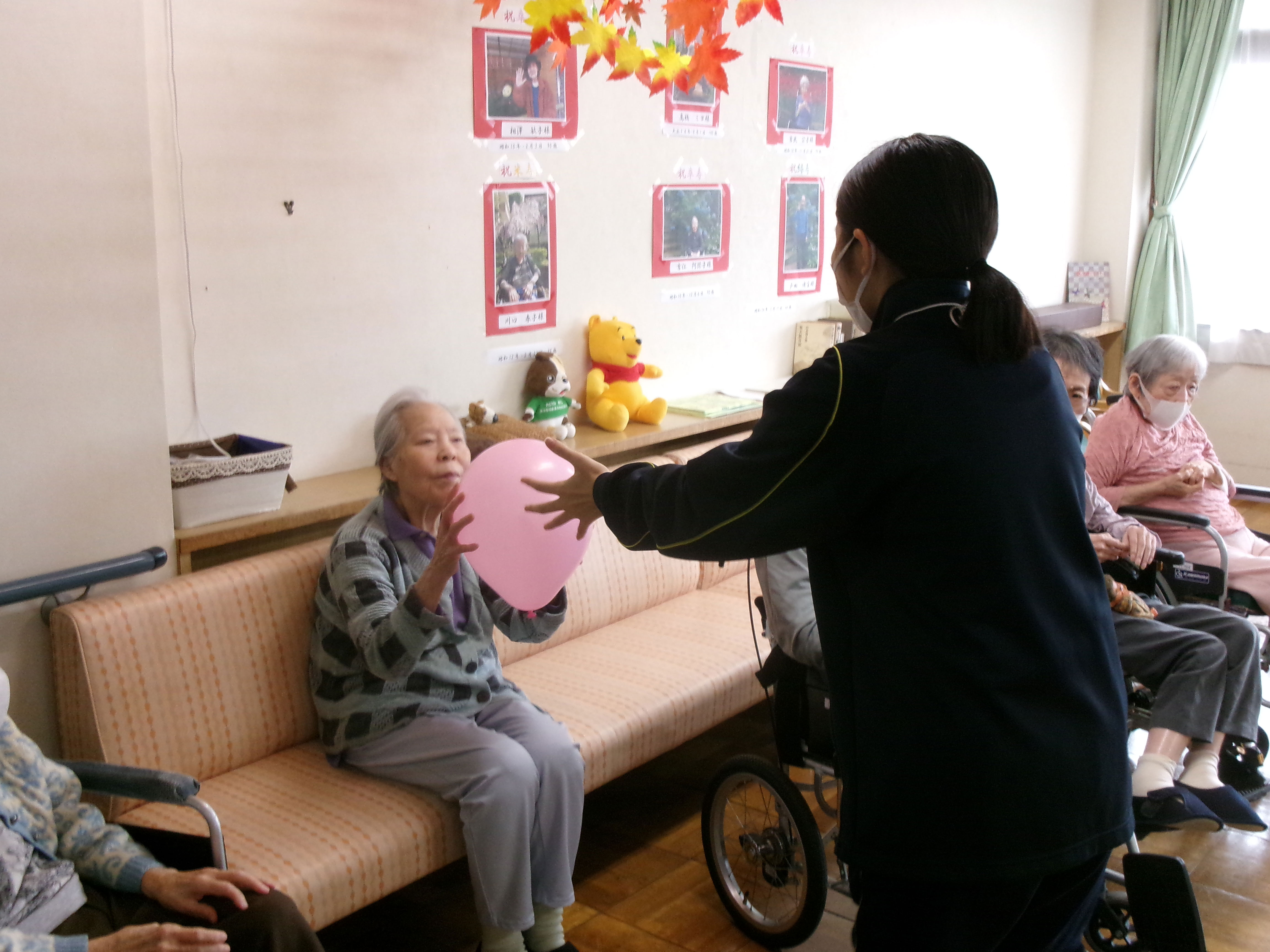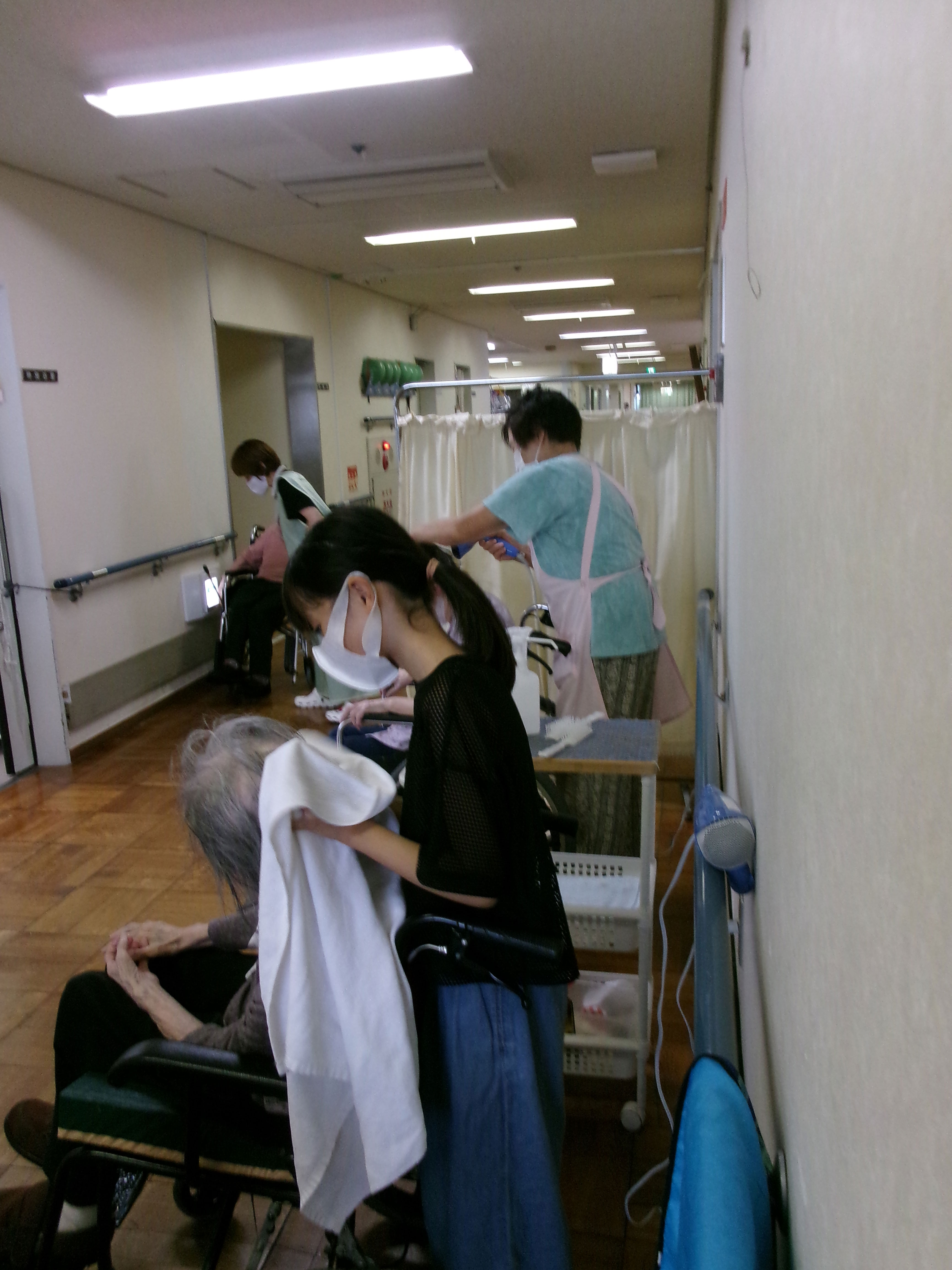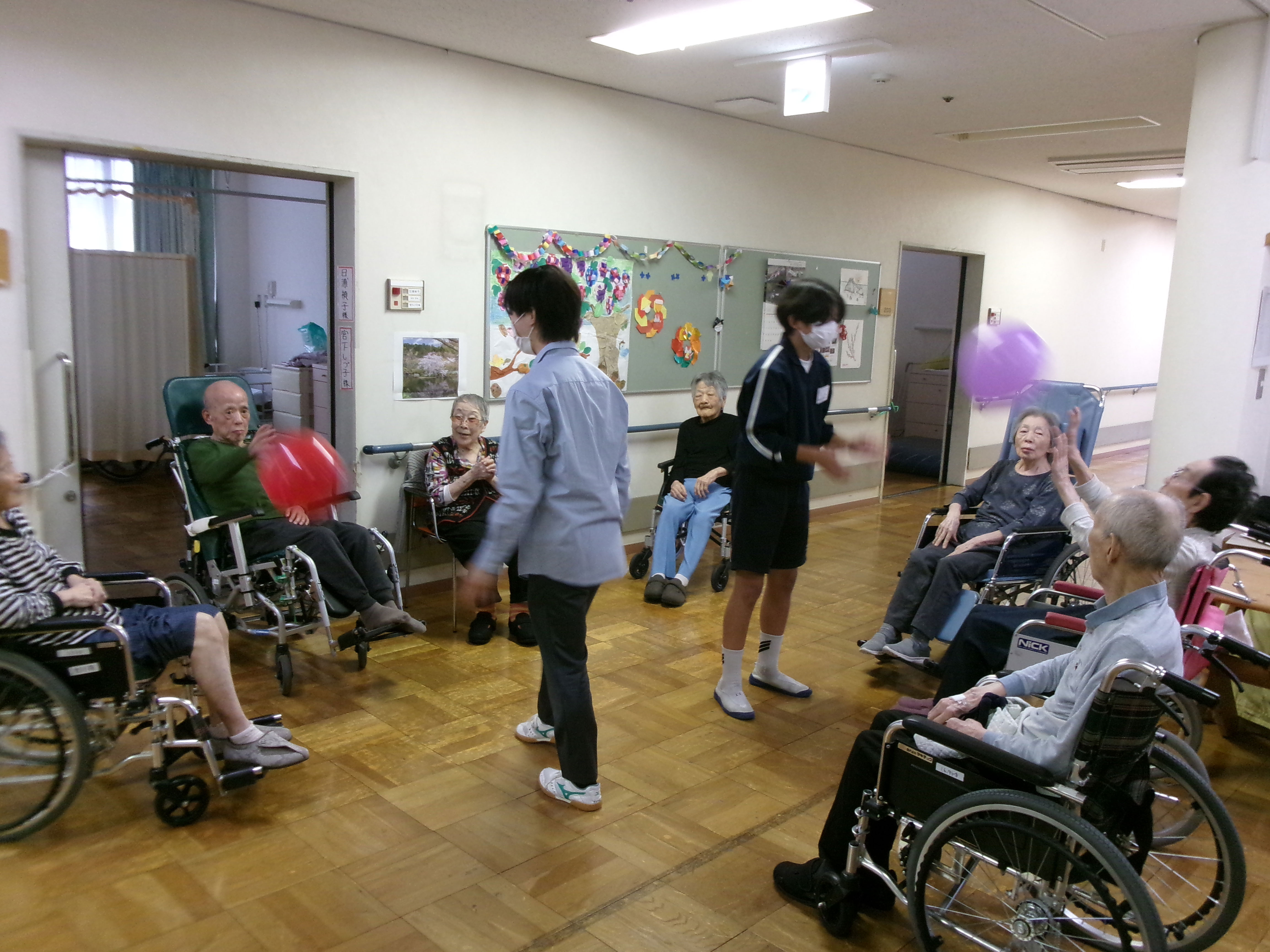 ご利用者の食事の風景や特殊浴槽の見学を行い、入浴後の利用者のドライヤー掛け、風船バレー、おやつ作りを一緒に行いました。