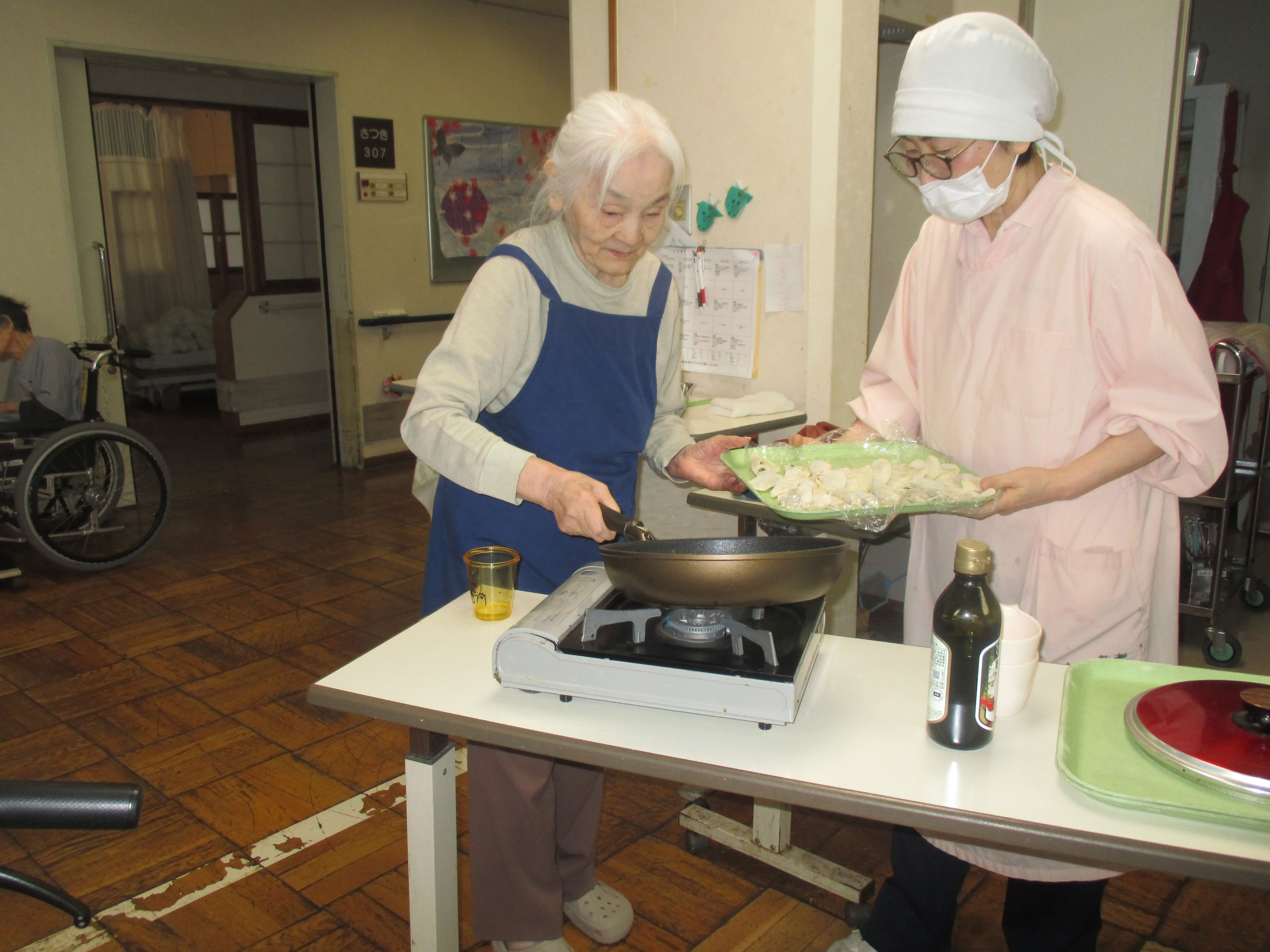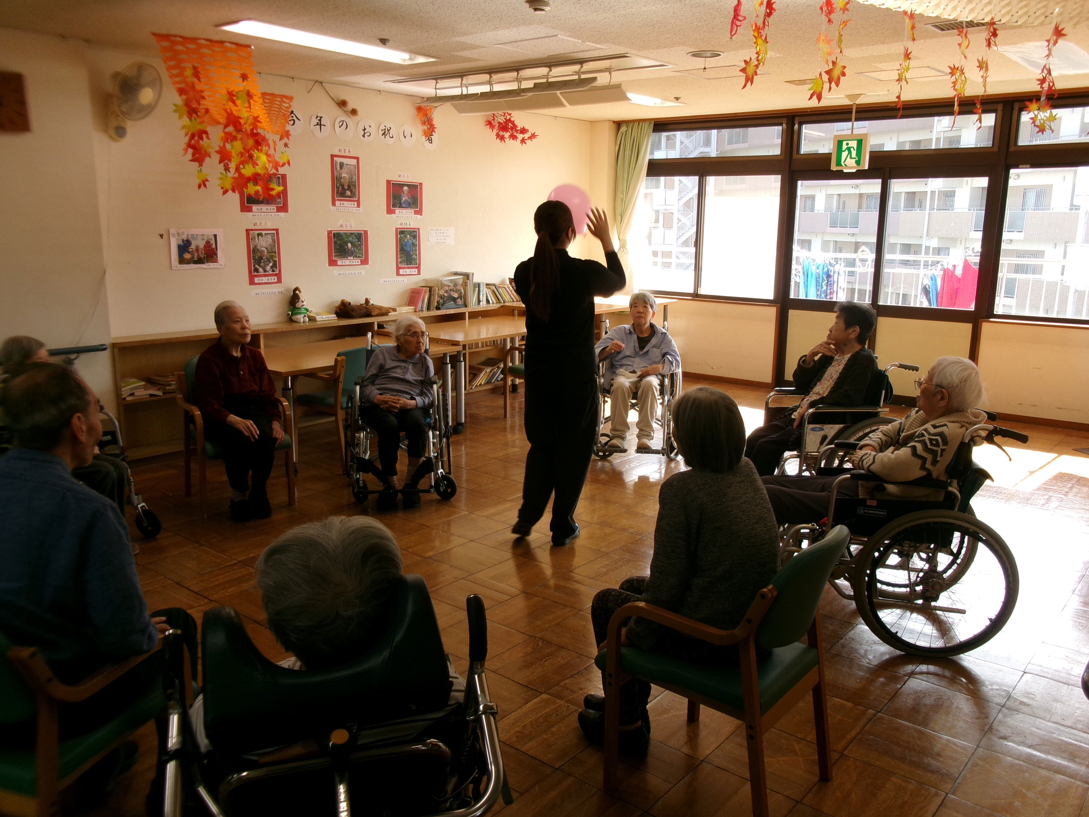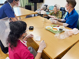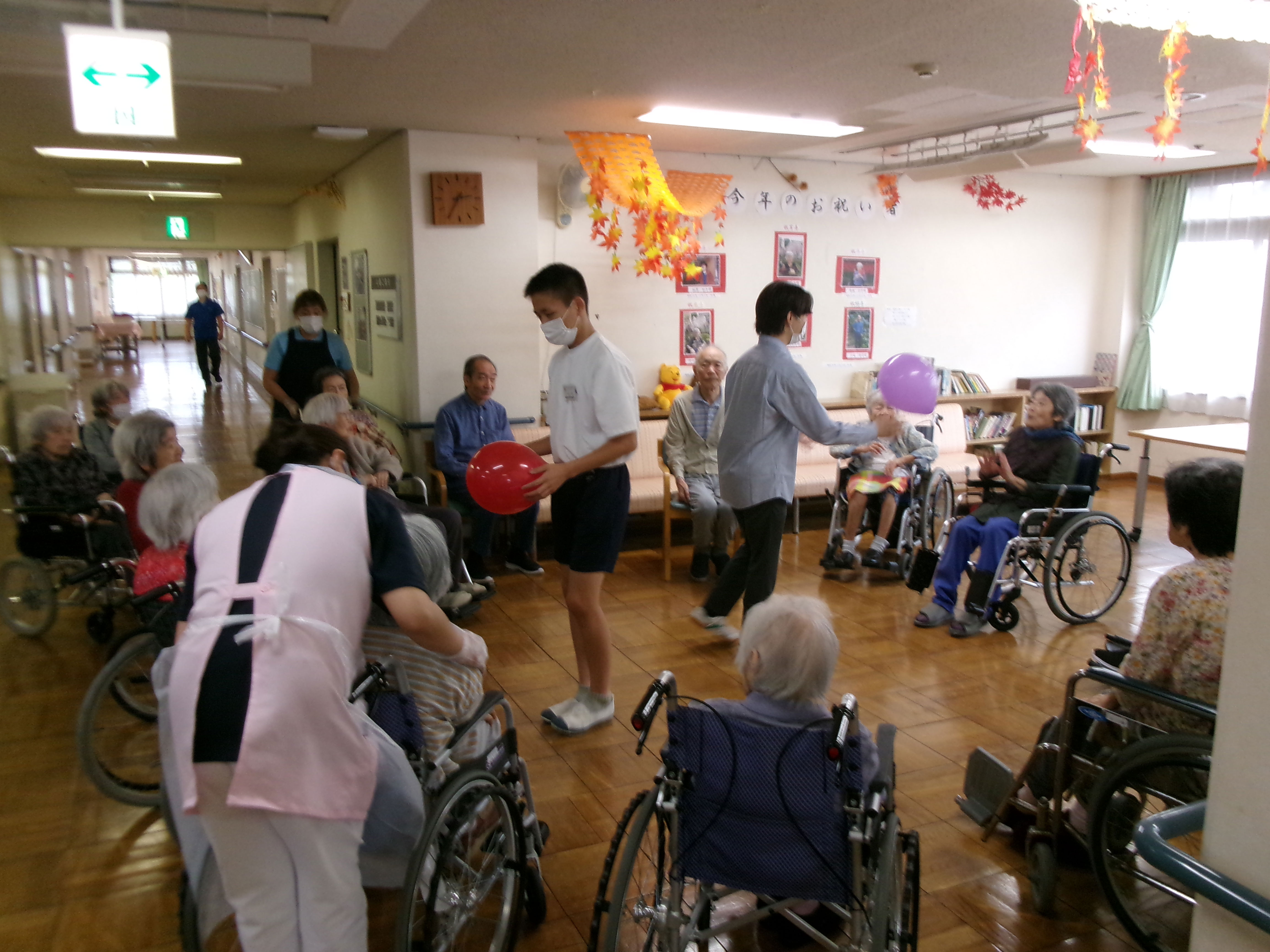 ご利用者の食事の風景や特殊浴槽の見学を行い、入浴後の利用者のドライヤー掛け、風船バレー、おやつ作りを一緒に行いました。
