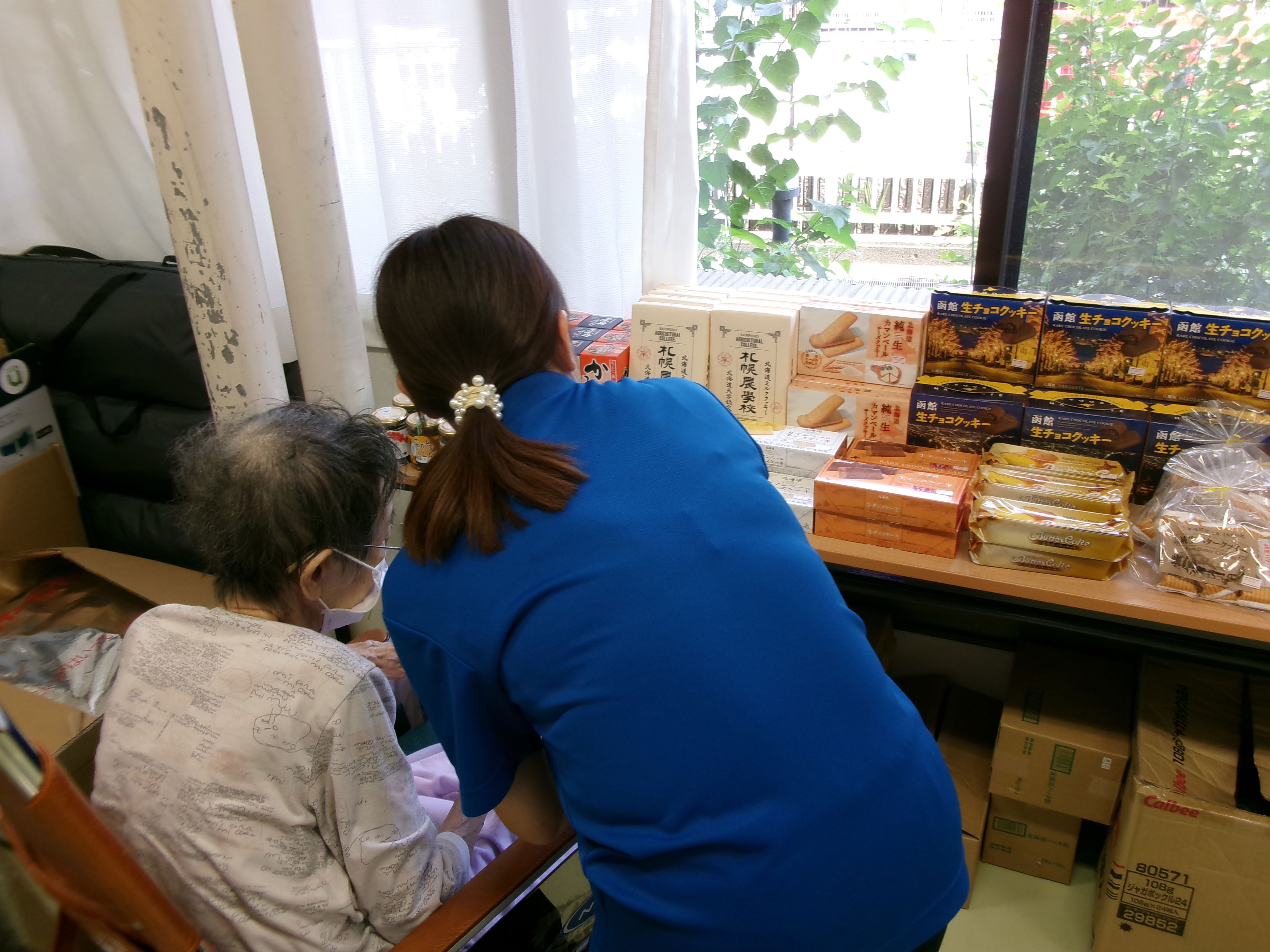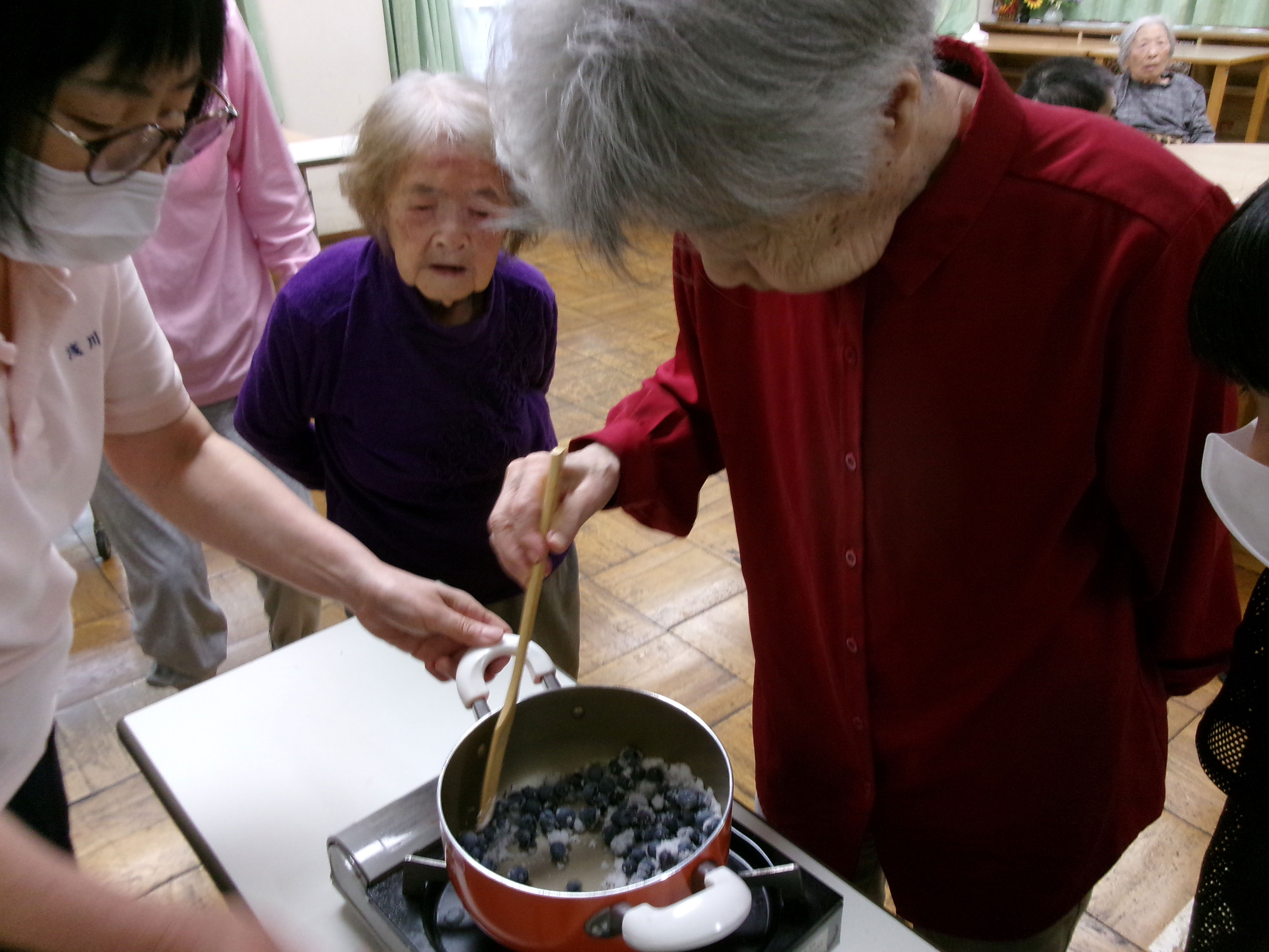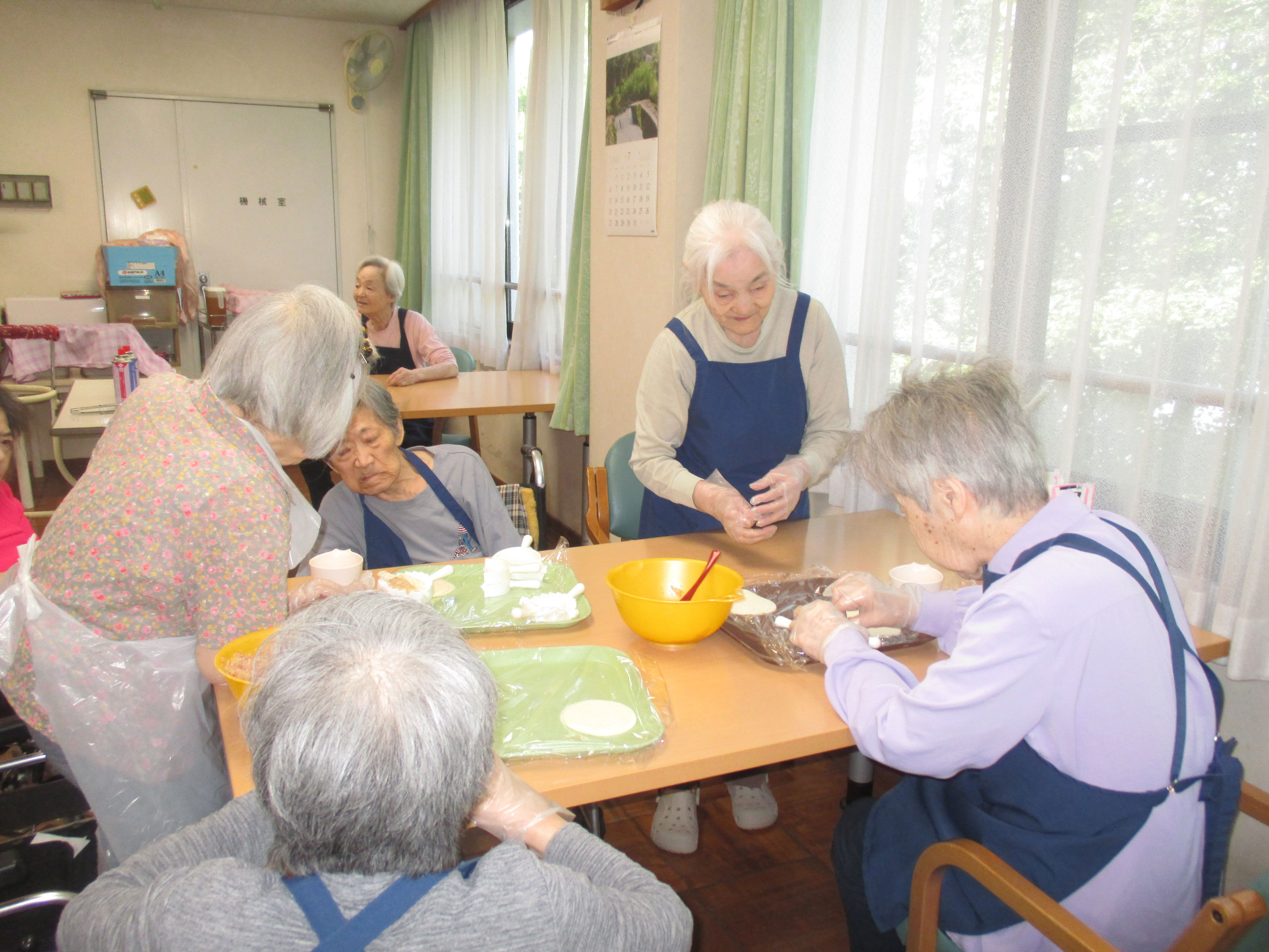 「鮎祭り」と題し、おやつバイキングを行いました。手作りのおやつを7種類用意し、好きなものを選んで頂きました。皆さん甘いものは大好きですね!