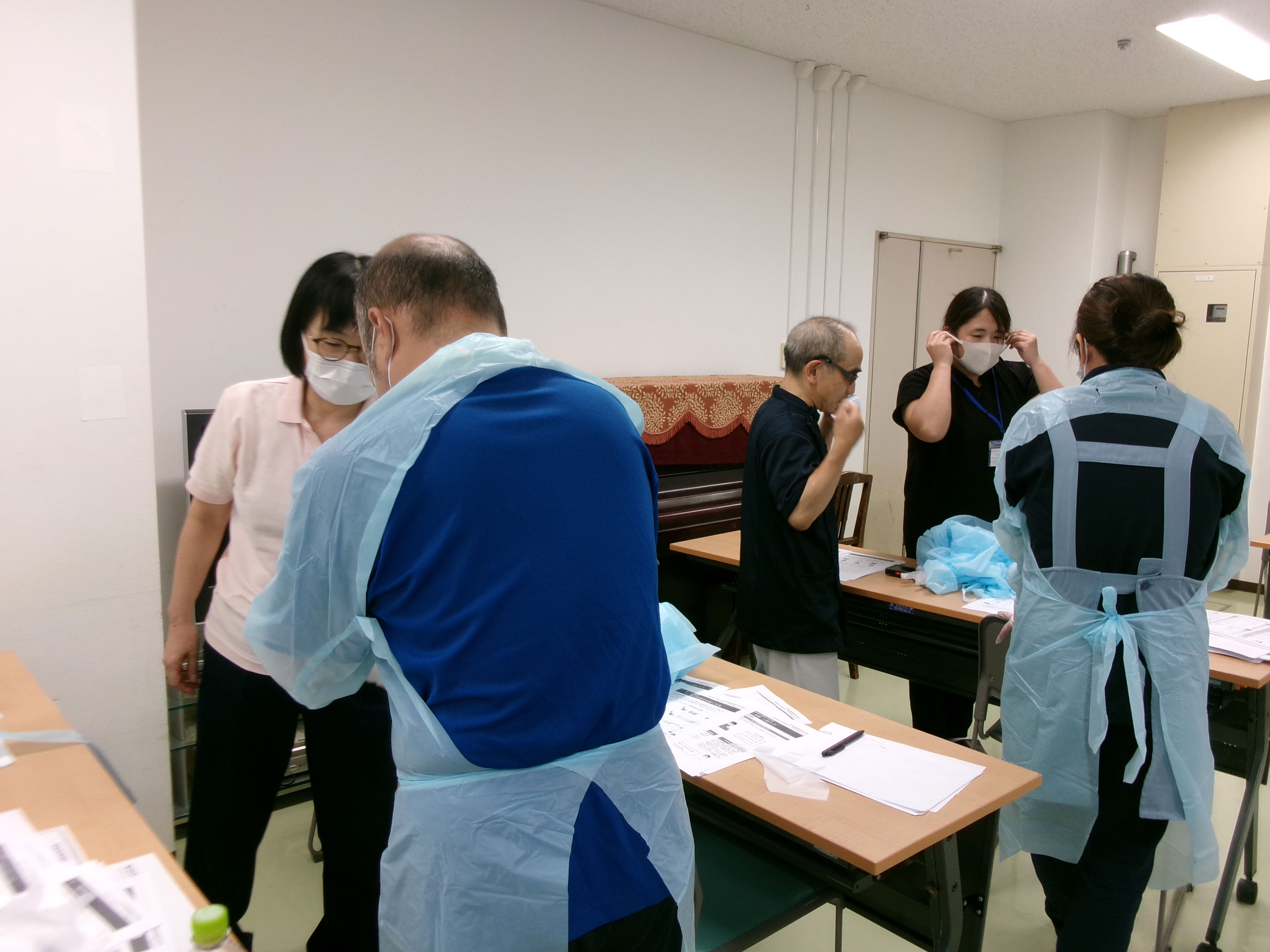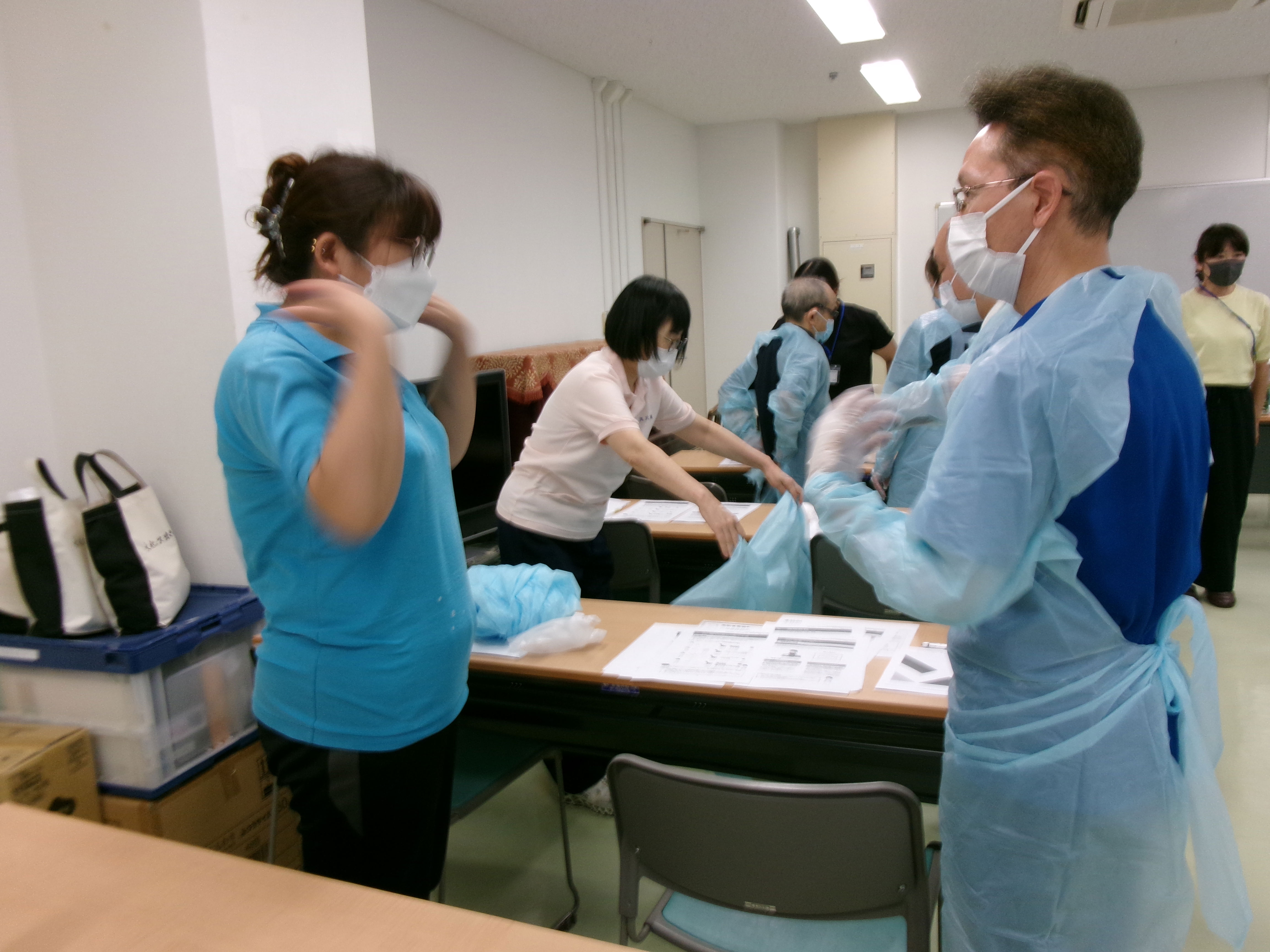 今回の研修は手指消毒(感染症対策の基本)と個人防具の理解、脱着の手順を再度確認しました。