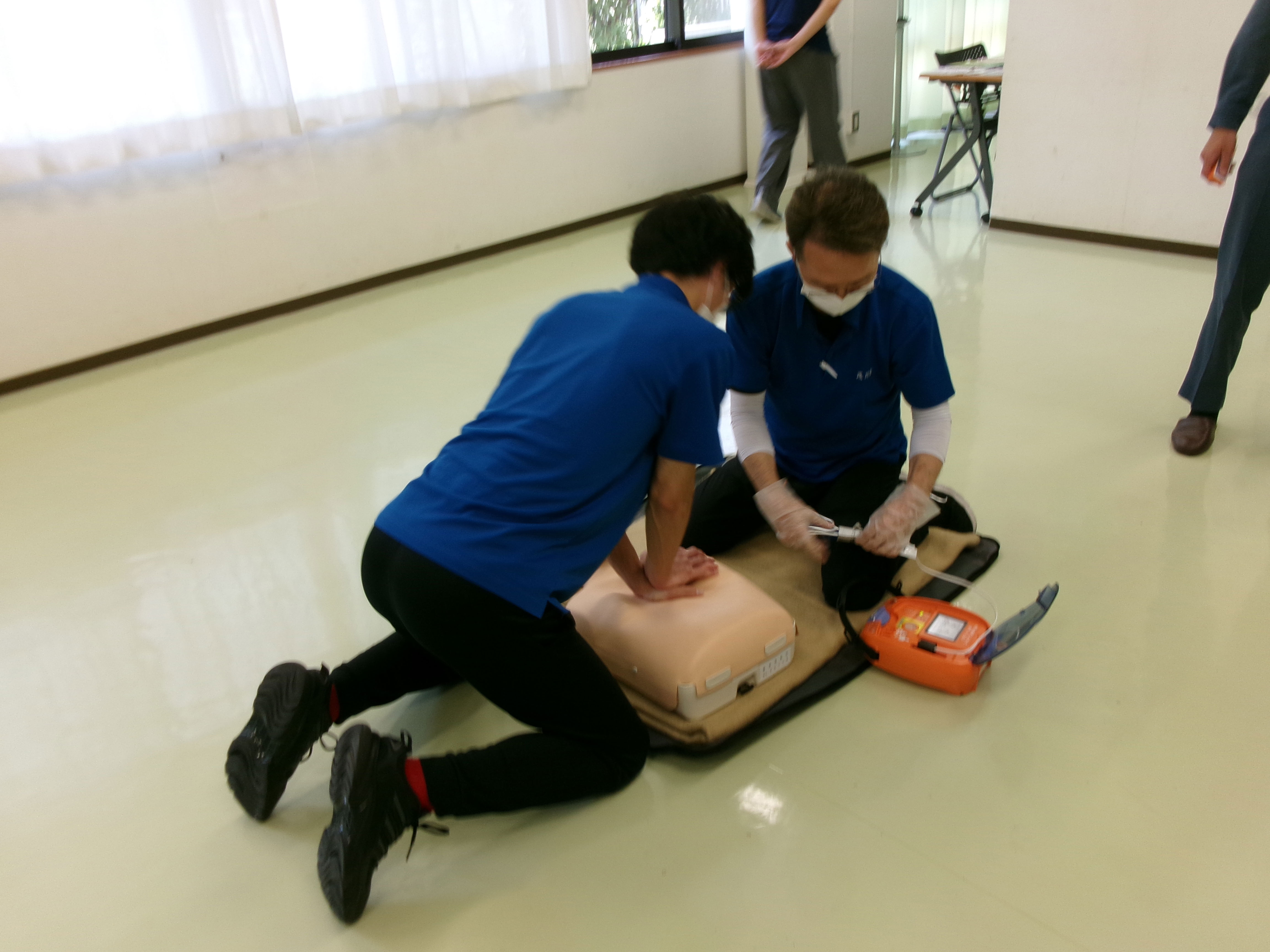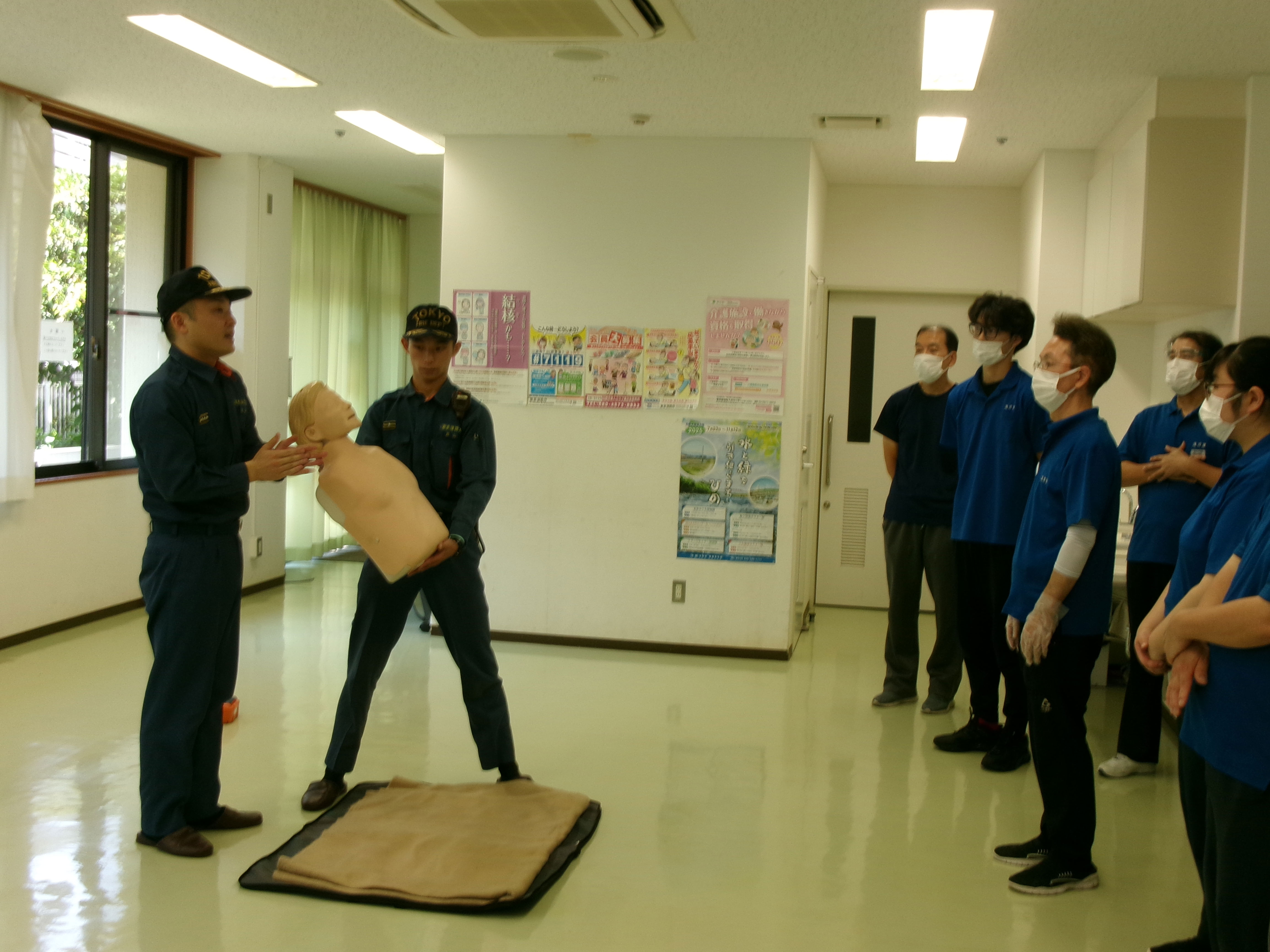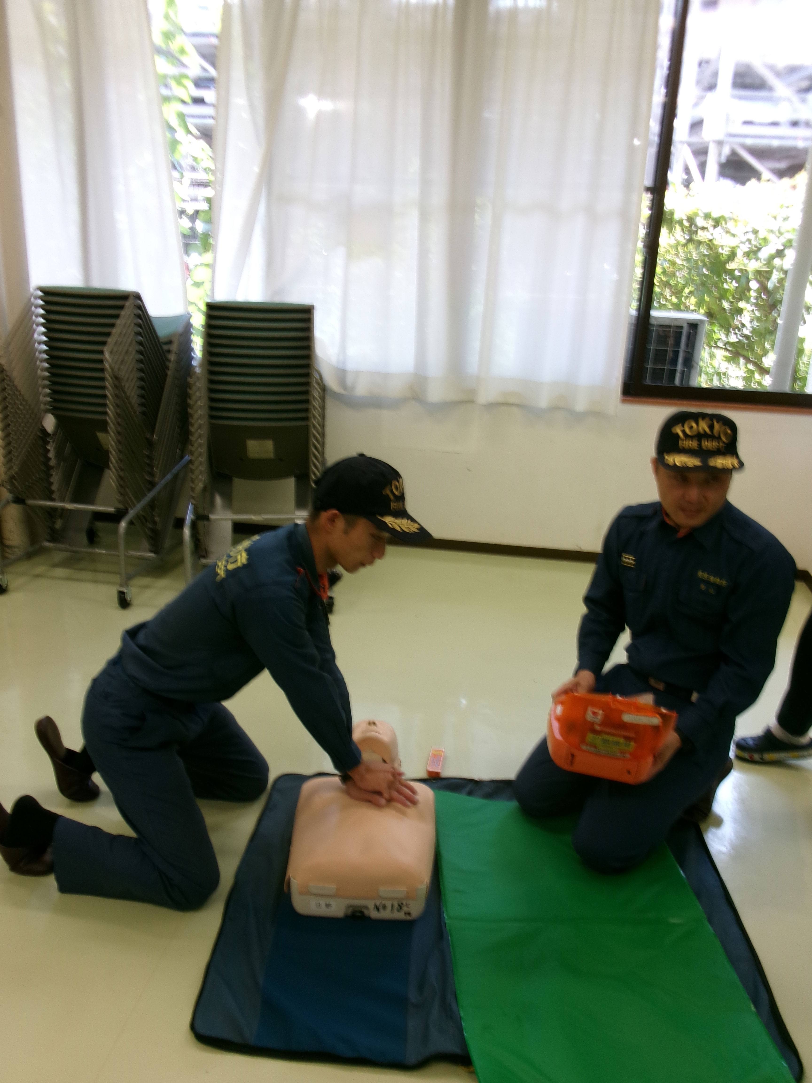 今年も日野市消防職員の方に模範講習をして頂き、心臓マッサージとAED使用による正しい心肺蘇生法を確認しました。