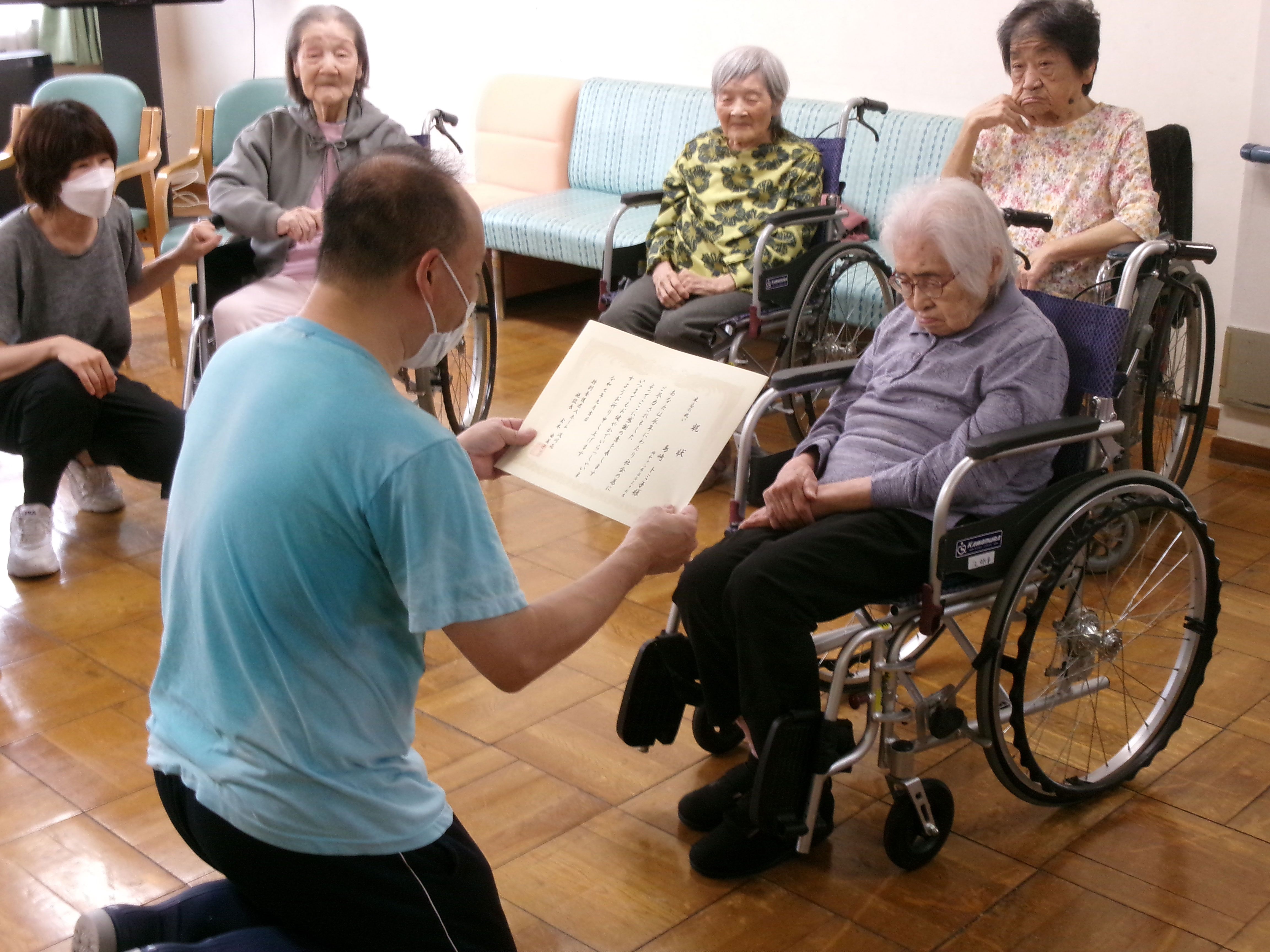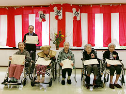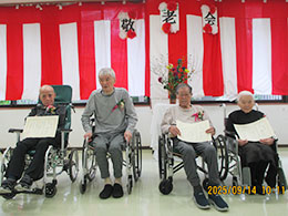 今年も皆さんにとってとても大切な「敬老の日」のお祝いを行いました。今年度は長寿を祝う新しい賀寿、禄寿66歳のお祝いの方、100歳のお祝い百寿の方、節目の年齢の方が14名いらっしゃいました。ご家族をお招きして皆さんの表彰を行いました。