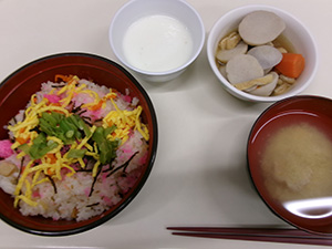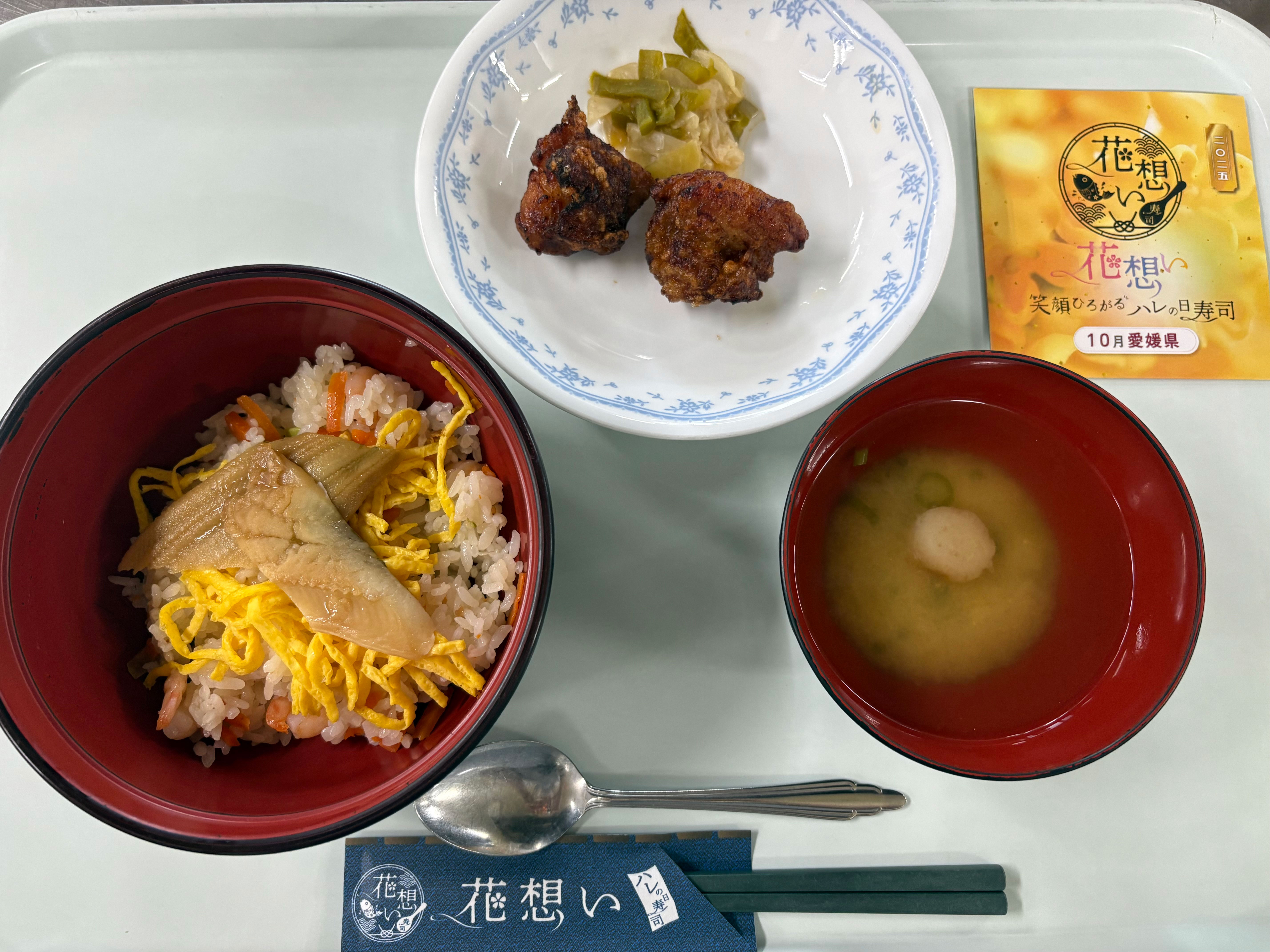 10月の行事食は「松山鮓」です。愛媛県の郷土料理です。明治時代に文豪・夏目漱石が松山を訪れた際、俳人正岡子規の母がもてなしたことで知られています。