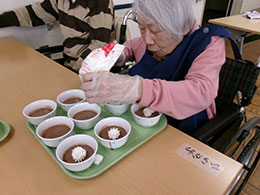 バレンタインの日におやつ作りを行いました。チョコレートババロアの上にホイップ クリームをトッピングして、楽しく美味しい時間を過ごしました!