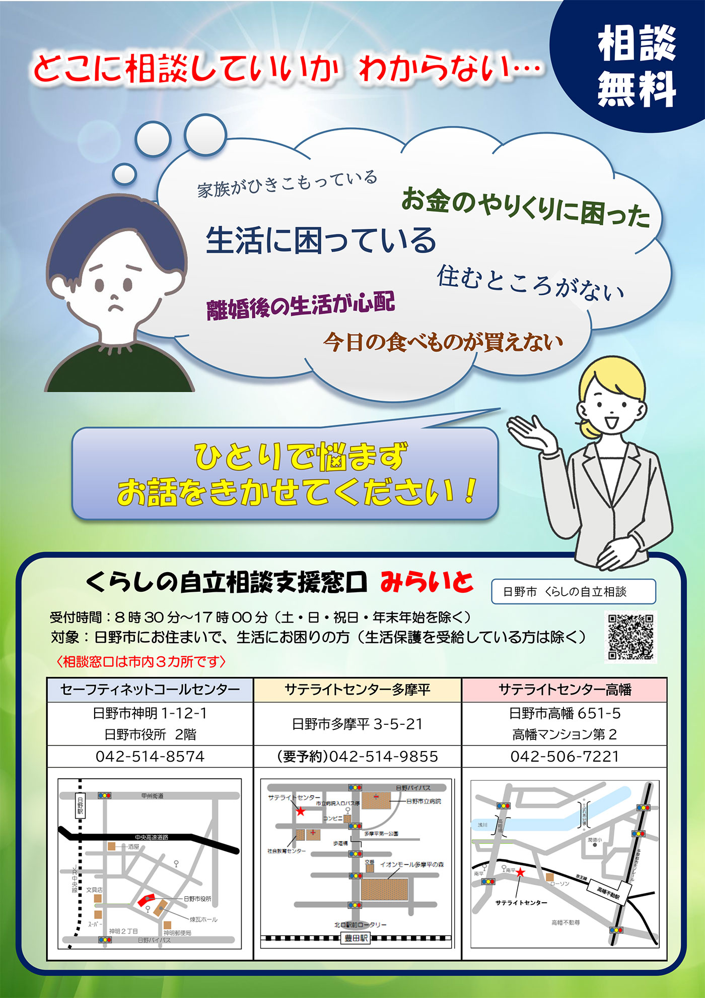 - 対象:日野市にお住まいで、生活にお困りの方(生活保護を受給している方は除く)