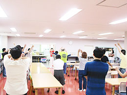利用者の社会参加支援や活動に重点をおいて支援しています。今年は健康維持のため、ラジオ体操の講師をお呼びして運動を行いました。