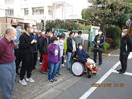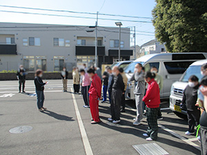防災訓練を行い、第一避難場所の近隣小学校までみんなで歩いて、経路を確認しました。 毎月1日に行っている「171訓練」も継続して行っていきます。