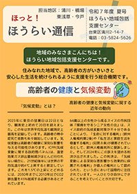 このまちで暮らし続けたい”を応援します。 地域包括支援センターは、地域の高齢者がいきいきと安心した生活を続けられるように、社会福祉士・主任ケアマネージャー・保健師などが相談や支援に応じる“高齢者の総合相談窓口”です。 地域包括支援センターとは?高齢者が住みなれた地域で自立した生活を継続できるように、生活を総合的に支えていきます。 平成18年4月1日から介護保険法の改正に伴い創設された機関で、地域住民の心身の健康維持や生活の安定、保健・福祉・医療の向上、財産管理、虐待防止など様々な課題に対して、地域における総合的なマネジメントを担い、課題解決に向けた取り組みを実践していくことをその主な業務としています。 認知症家族介護者教室のご案内家族介護者同士 で交流しながら、認知症の基礎知識、認知症の方との上手な接し方、ストレスを溜めないコツ(認知行動療法)を学んでみませんか? 市民向け認知症セミナー開催のお知らせどなたでも参加でき、認知症について正しく学べる講座を開催しています。 「認知症とは?」、「症状と対応について」、「相談先や受診の流れについて」などを学ぶことができます。ご興味のある方はぜひご参加ください。講座終了後に、講師を務める地域包括支援センター職員にその場で相談することもできます。 あさがおカフェ(認知症カフェ)開催のお知らせほうらい地域包括支援センターでは、認知症の方やその家族、認知症に関心のある方など、誰でも参加できる“あさがおカフェ”(認知症カフェ)を開催しています。医療や介護の専門職、同じ立場の方と気軽にお茶を飲みながら、お話ししませんか?各種講演やイベント、個別相談などもご用意しておりますので、お気軽にお越しください。 認知症家族介護者交流会のお知らせ認知症のご家族のケアをしている方、ケアをした経験のある方を対象に、交流会を行っています。 サービスの内容総合相談・支援高齢者の日常生活の支援や、介護に関するさまざまな相談をお受けします。