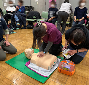 人形を用いた実技訓練を通して胸骨圧迫やAED操作の手順を確認しました。