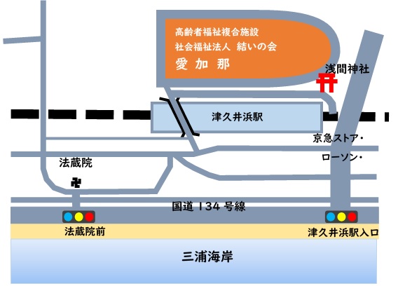 ・京浜急行線津久井浜駅から改札を出て左側の線路脇を三浦海岸方面へ直進。