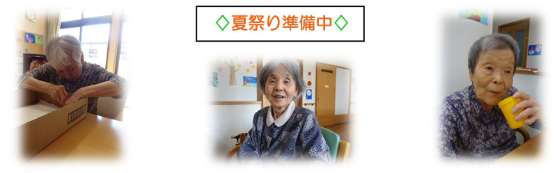 夏祭りに向けて着々と準備が進んでおります。左の写真では金魚すくいの屋台の準備をしております。当日には段ボールの中に金魚がいっぱいになっていると思うとワクワクしますね(^^♪。準備している様子を見ながらお風呂上がりの一杯を飲みながら楽しまれておりました(*^_^*)。