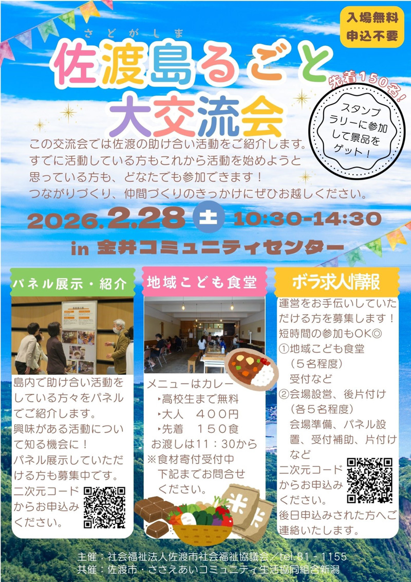 この交流会では、佐渡の助け合い活動をパネル展示で紹介します。また、地域こども食堂や授産品の販売、スタンプラリーなど内容盛りだくさん。活動実践者との交流を通じて助け合い活動を学ぶこともできます。