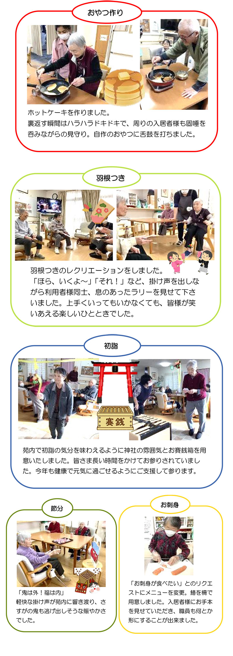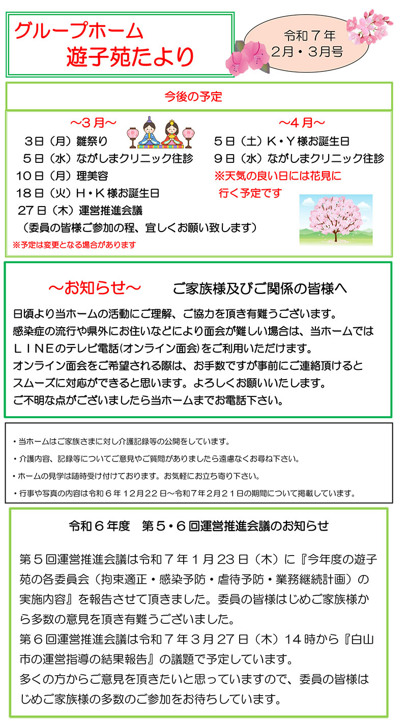 1.苑内の掲示物やホーム便り、ホームページ等に入居者様のお名前や写真が掲載される事があります。不都合な場合は、配慮させて頂きますのでお知らせください。