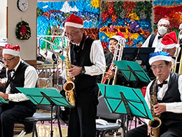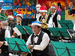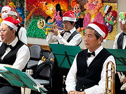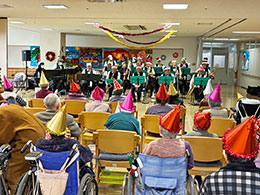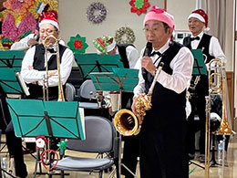 慰問にて“スウィング・スロープ・オーケストラ”の方々にお越しいただき、クリスマスの雰囲気を感じられる素敵なコンサートを開催頂きました。目の前での演奏により、迫力あり感動ありと、素敵な音色にご利用者様もうっとりとされていました♪
