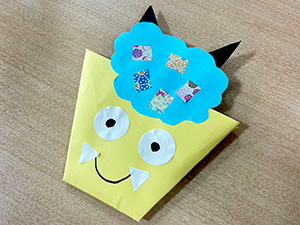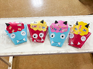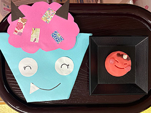鬼の面への的当てゲームを実施、その後は折り紙で袋状の鬼の顔を制作頂き、その袋にお菓子を詰めてプレゼントさせて頂きました(o^^o)
