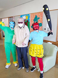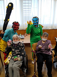 今月は、新年初の行事ですのでご利用者様と職員一同で「新年会」を行いました。職員による、けん玉の披露、楽器に合わせて歌を歌いました。最後に「金色夜叉」を披露し皆様に初笑いしていただきました。おやつは、新年に相応しい富士山の形をしたケーキを提供しました。参加されたご利用者様皆様楽しまれていました。