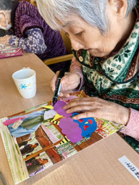 ご利用者様にお花紙で小さなお花を作る手先を使う作業、形になるように考えながら貼る作業を行いました。完成後、皆様で鑑賞し「いいのができたね〜」「すごいね!」「コロナが落ち着いたら孫と一緒に出かけたいな♥」とお話がありました。
