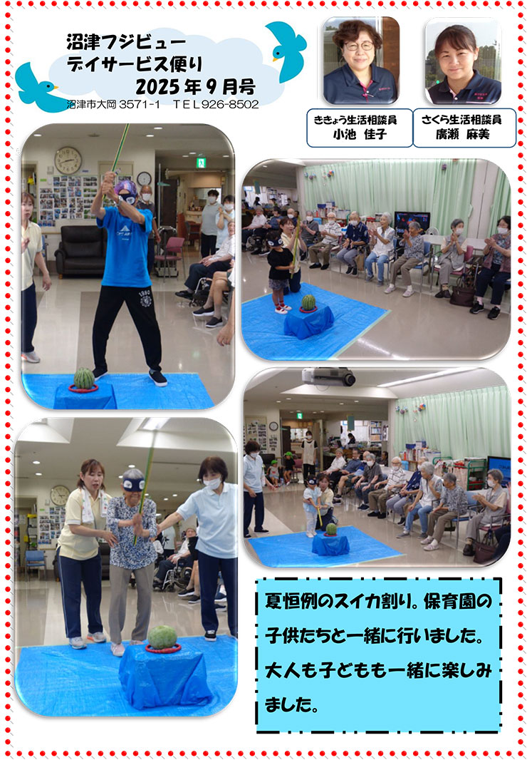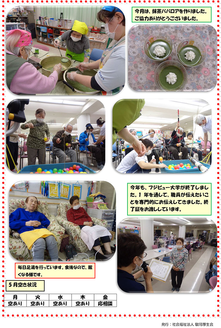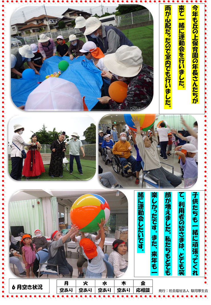 - 年間行事 : 誕生会、手作り料理、運動会、納涼祭、敬老会、クリスマス会、新年会、節分、ひなまつり、梅茶会