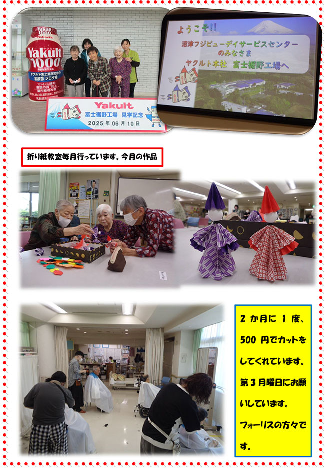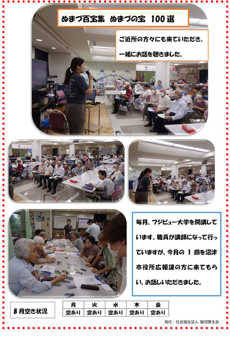 - レクリエーション活動 : ゲーム、カラオケ、ビデオ鑑賞、野菜の収穫作業、作品作り、手作り料理、誕生日会