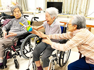 運動会を開催しました!ご入居者様の体調や天候を考慮し、室内での開催となりましたが、紅組と白組に分かれて行われた競技(メディシングボール・玉入れ)では、皆様が一生懸命に応援し合い、助け合う姿が見られました。いつも以上に活気あふれる雰囲気の中、楽しそうに競技に参加される様子に、私たちスタッフも元気をいただきました。