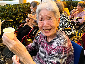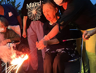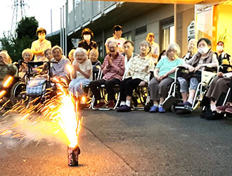 8月下旬、夏の恒例行事として花火大会を行いました。夕暮れの涼しい風を感じながら、手持ち花火を楽しむ方や打ち上げ花火を眺めながら拍手される方もいて「綺麗だね!」「懐かしいね」とたくさんの笑顔が見られました。途中でジュースを飲みながら一息つき、花火と共に残り少ない夏を感じながら、笑顔と歓声に包まれた心温まるひとときとなりました。