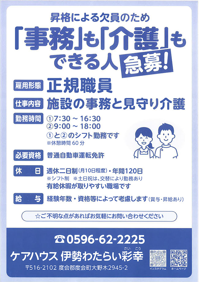 社会福祉法人三重豊生会ケアハウス伊勢度会彩幸では下記スタッフを募集しております。