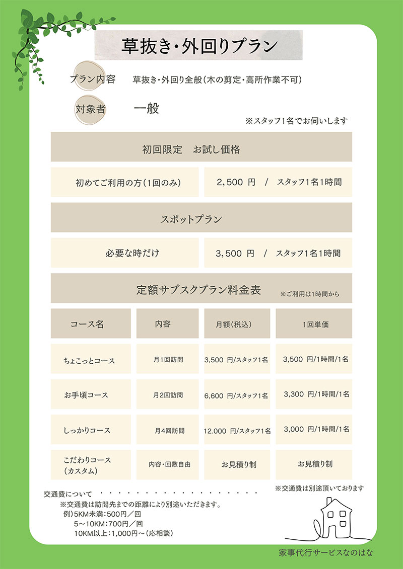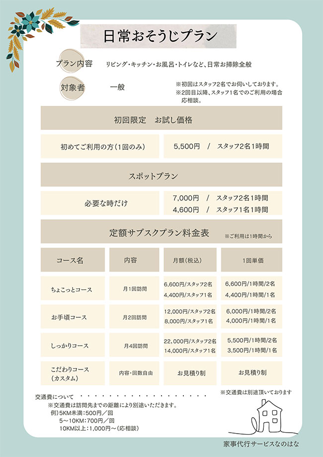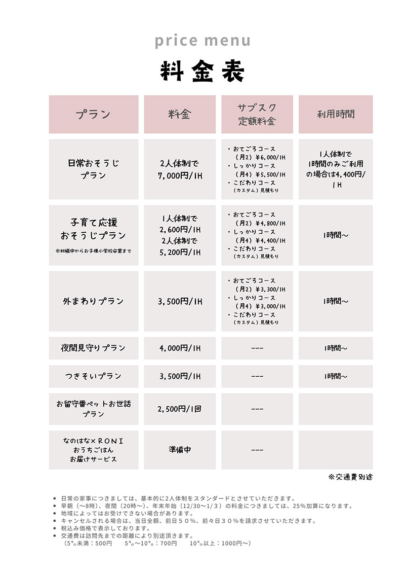 共働きが当たり前の忙しい現代人にとっては、家事代行サービスは今後さらに需要が高まると予想されています。 なのはなでは、子育て世帯の方でもご利用しやすい価格帯を実現。まずは、一度お気軽にお問合せください。 きっと、皆さまの日常生活に少しの余裕が生まれることで、子供さんとの時間にあててもらったり、趣味の時間を 増やしたりなど、新しい生活スタイルが生まれてくるかもしれません まずは、ご体感ください!