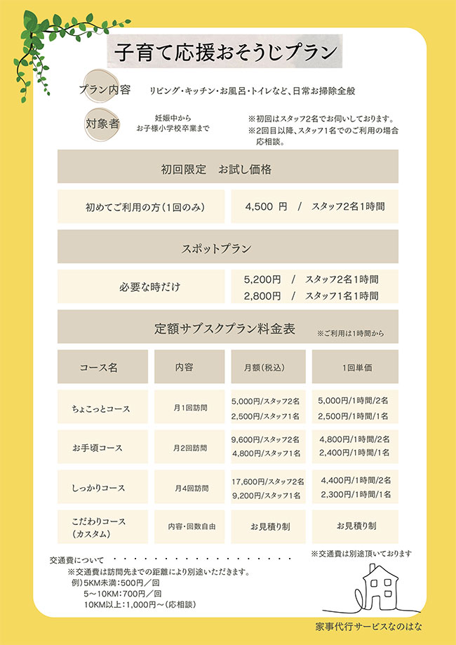 日常的な掃除・洗濯・料理作り・買い物などの忙しい皆様に代わって家事全般の対応をしております。特に小学校のお子様がおみえになる子育て世帯の方は、子育てプランにてお得にご利用して頂けるなど、子育て世帯に優しい料金体制を実現しました。
