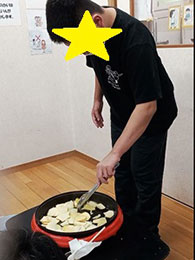 工程表の写真を確認しながら見通しをもって取り組みます。粉や水の軽量や具材を切ったり、生地を伸ばしたりと、一生懸命取り組んでくれていました。
