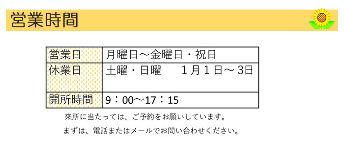 | 休業日 | 土曜日・日曜日、1月1日~1月3日 |