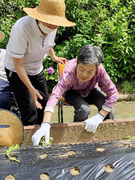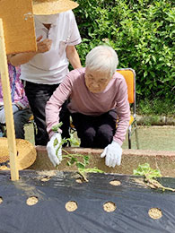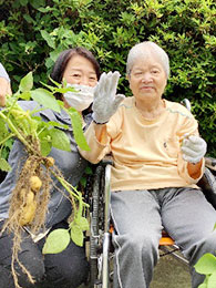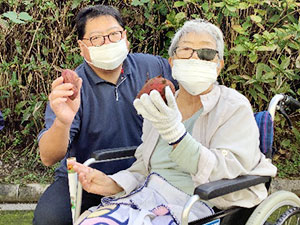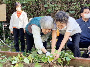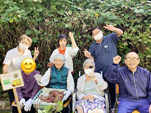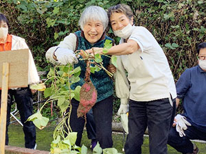 秋が深まるこの頃、山口苑では畑のさつまいもを収穫しました。葉の生い茂ったツタを力いっぱい引っ張ると、大小様々なさつまいもが土の中から出てきました。なかには何も付いていないハズレのツタも…(笑)お天気も良く、談笑しながら秋の実りを楽しみました。
