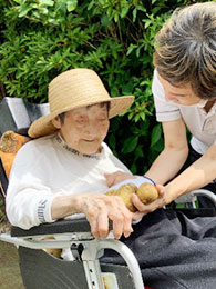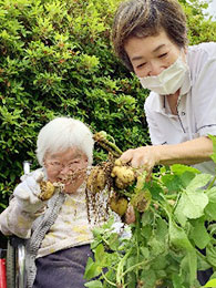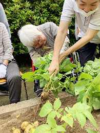 初夏の爽やかな風が木々の緑とたわむれる頃となりました。 入所者の皆さんと一緒に畑で育てていたジャガイモを収穫しました。