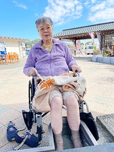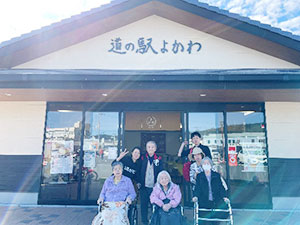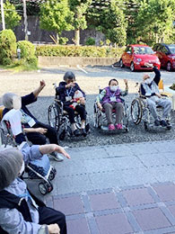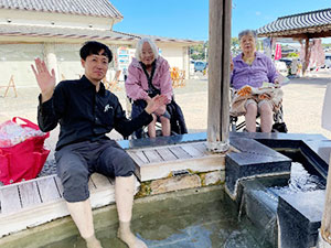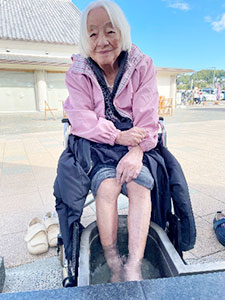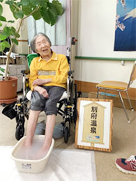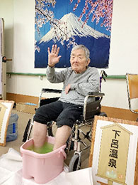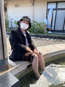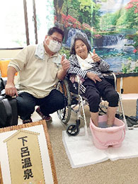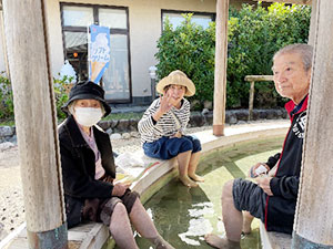 山口苑から車で20分、爽やかな秋晴れの日に三木市にある吉川温泉に出掛け ました。 ジャケットを羽織るとちょうどよい気候でしたが、温泉に足を浸けるとじんわ り体が暖かくなり、心地良い風に吹かれながらのんびり過ごすことができまし た。 車椅子をご利用の方も足湯を楽しめるようになっており、利用者さんからは 「ぼかぽかして気持ちよかった」「久しぶりの小旅行でワクワクした」との声 が聞かれ、いい気分転換になったようです。