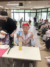 まだ6月だというのにうだるような暑い日々が続きますね。 そんな暑さを吹き飛ばすように、1階フロアで運動会を開催しました! 普段は皆さん仲良くお過ごしですが、今日は紅組と白組にわかれて真剣勝負! 玉入れ、輪っか送り、障害物リレーで競い合いました。 スタッフも競技に参加し、アメ食い競争で真っ白になった顔を見て、皆さん 大笑いされていました。