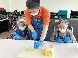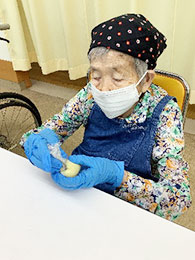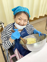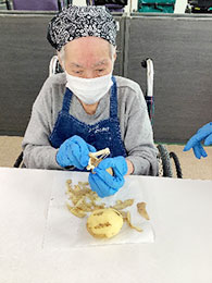 先月畑で収穫したじゃがいもを使って、茶巾絞りを作りました。 じゃがいもの皮をむき、蒸したいもをつぶし、ラップで綺麗に丸めて絞ります。 それぞれの工程を皆さんで分担し、手際よく作っていきます。 スタッフも包丁でじゃがいもを切りますが、ぎこちない手付きに傍で見守る 利用者さんはそわそわハラハラ…。 無事出来上がり、利用者さんからは「お店で売れるかも?」と高評価をいただきました。