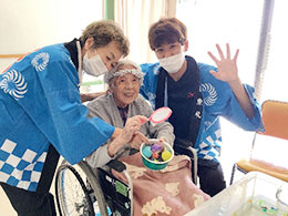 入所されている野田はるこ様が昨年に続き西宮市内女性最高齢を更新され、今年は男女合わせて最高齢の110才になられました。石井西宮市長もお祝いのため来苑されご本人に賞状とお祝いの品を贈呈されました。